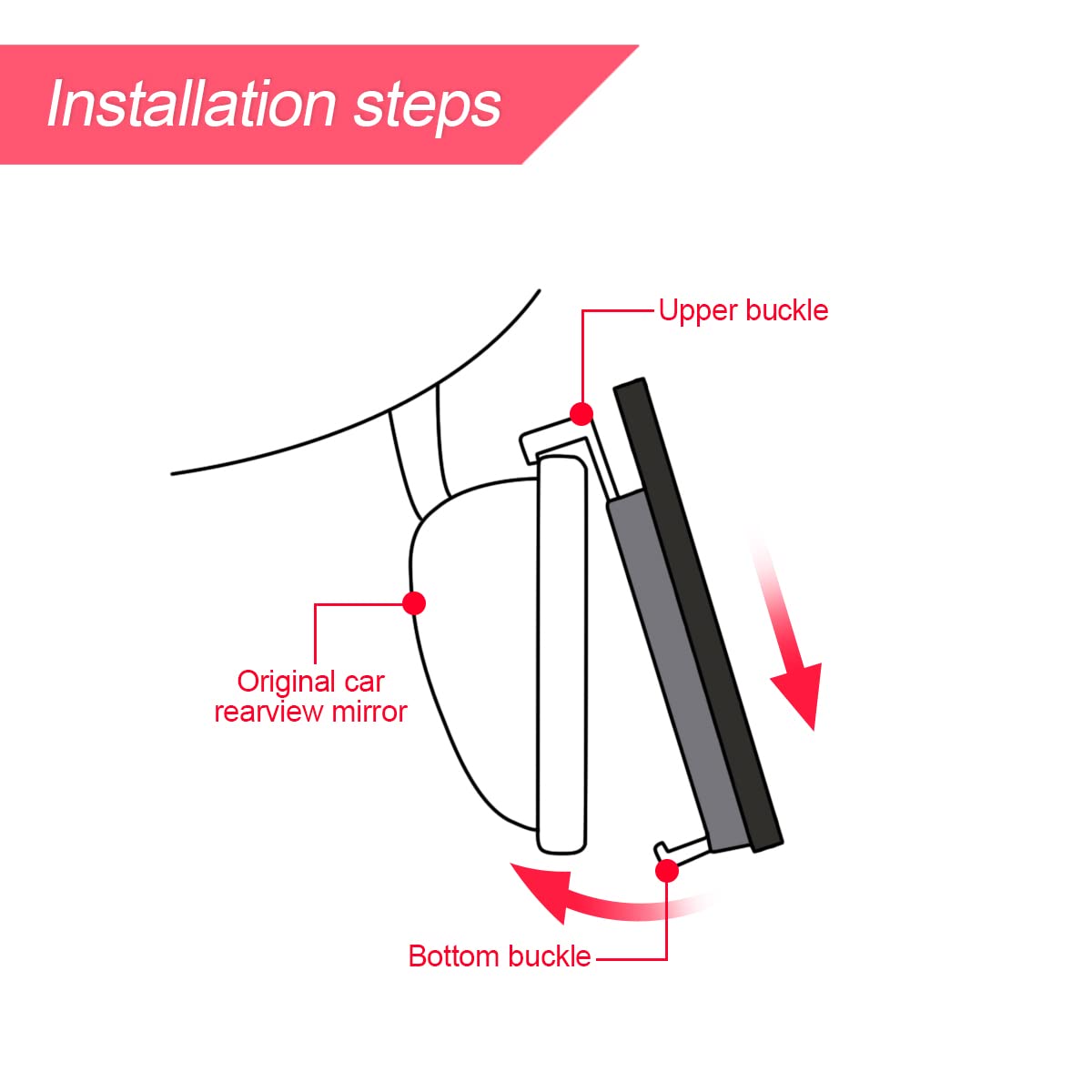 Q: How do I install the bling rearview mirror?A: Installation is easy and can be done in just a minute. Use the telescopic buckle design by stretching the clips, attaching the buckle on the mirror's edge, adjusting the angle, and then securing it in place.