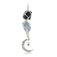 Boho Garden Hanging Car Charm - Black Tourmaline & Blue Calcite - Dangling Moon & Healing Crystal Accessories, Rearview Mirror Decorations - Confidence, Calmness, Creativity, Protection, Communication