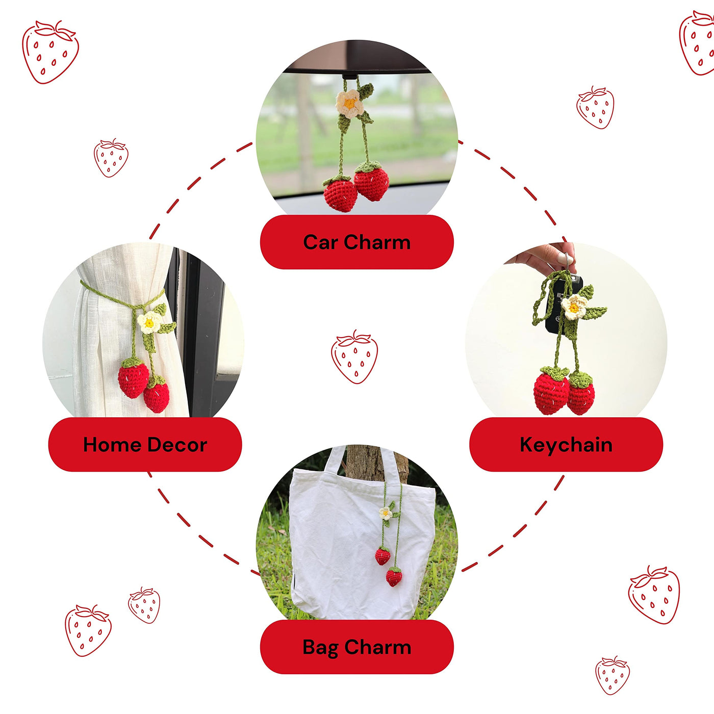 Bunny Crochet Strawberry Car Hanging Ornament, Handmade Car Rear View Mirror Hanging Accessories, Strawberry Car Ornament, Bag C