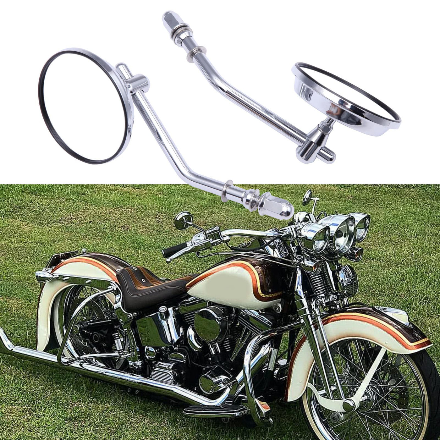 Q: What motorcycle models are compatible with these Chrome Motorcycle Round Sportster Mirrors?A: These Chrome Motorcycle Round Sportster Mirrors are compatible with a wide range of Harley Davidson models, including Sportster, Softail, Dyna, Road King, Street Glide, and Electra Glide, from various years. Specific models include Sportster 883, Sportster 1200, Softail Standard, FatBoy, and Road King among others.