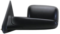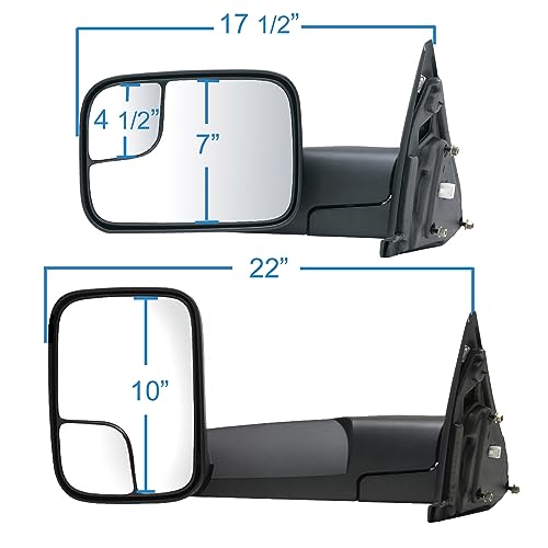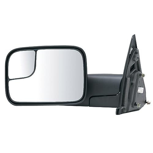 Driver Side Towing Mirror for Dodge Ram Pick-Up 1500, 2500/3500, with towing package. Textured black, spot Towing Mirror and flip-out head. Foldaway. Heated Power. Towing Mirror glass is power adjustable. Flat/ Convex. Towing Mirror glass has heating capability to clear ice, snow and fog. Manual folding for additional clearance. Towing Mirror has the ability to extend. Towing Mirror has no turn signal. Housing finish is Textured Black.