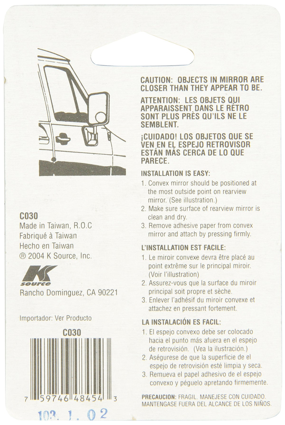 3'' Round. Wide angle blind spot mirror with mounting tape. Significantly reduces blind spots. As with all convex mirrors, objects in mirror will be closer than they appear. Optimal placement is on the bottom outside corner of driver or passenger side mirror, but can be placed in any position for blind spot reduction. It is highly recommended to test positions before mounting with adhesive.