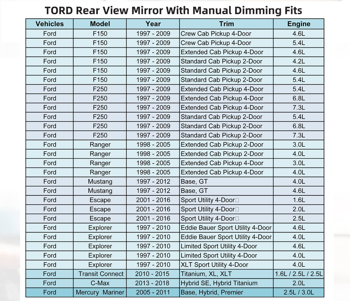 Q: What vehicles are compatible with the Ford Rear View Mirror?A: The Ford Rear View Mirror is compatible with various Ford models including the 1997-2009 F150, 1997-2009 F250, 1998-2005 Ranger, 1997-2012 Mustang, 2001-2016 Escape, 1997-2010 Explorer, 2010-2015 Transit Connect, 2001-2007 Mariner, and 2013-2018 C-Max.