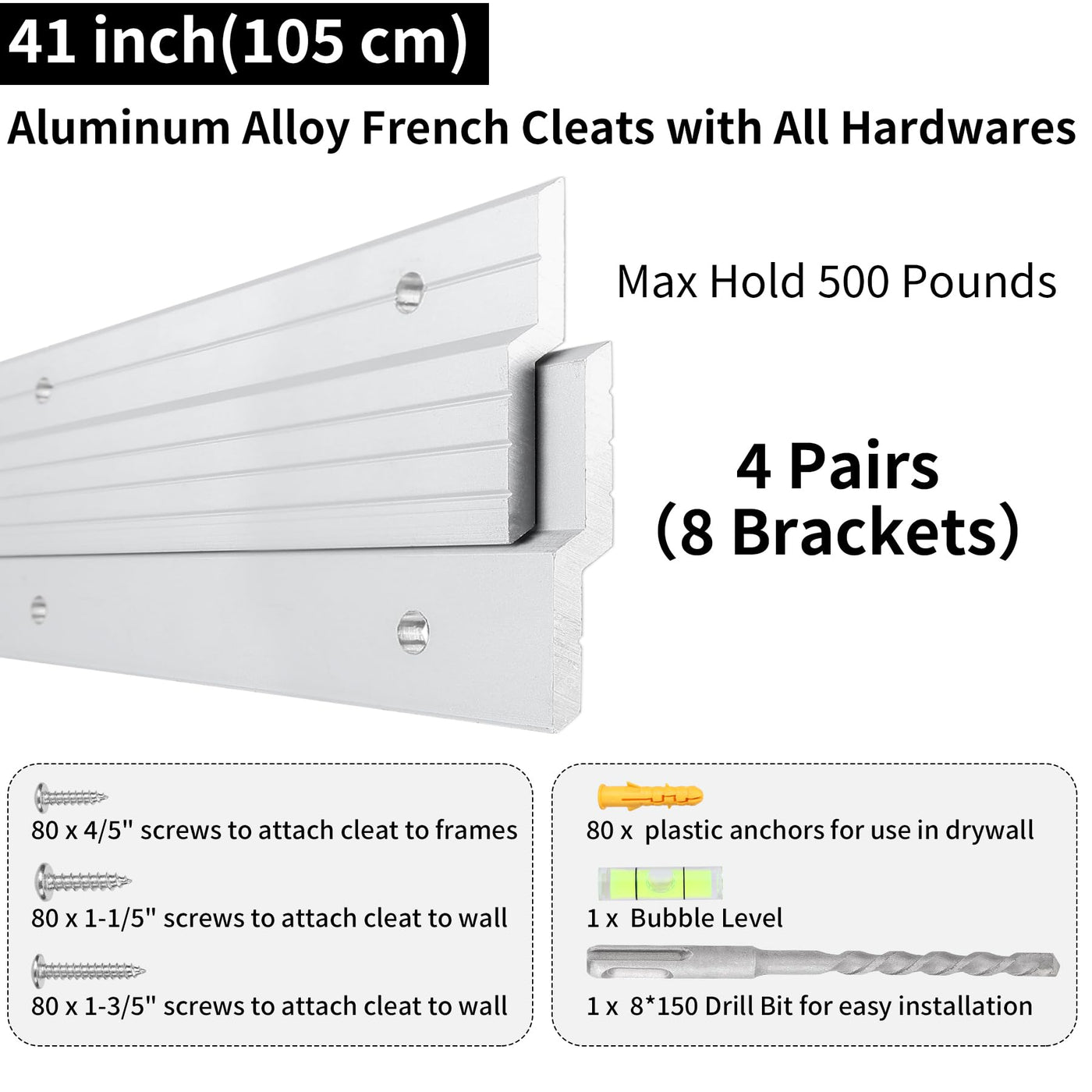 French Cleat Hanger 41 Inch - 4 Pairs Heavy Duty Aluminum Alloy Z Bar Clips Picture Hanging Kit Wall Mounting 500 Lbs Load Interlocking Brackets Mirror Hanging Hardware Frame Hanger