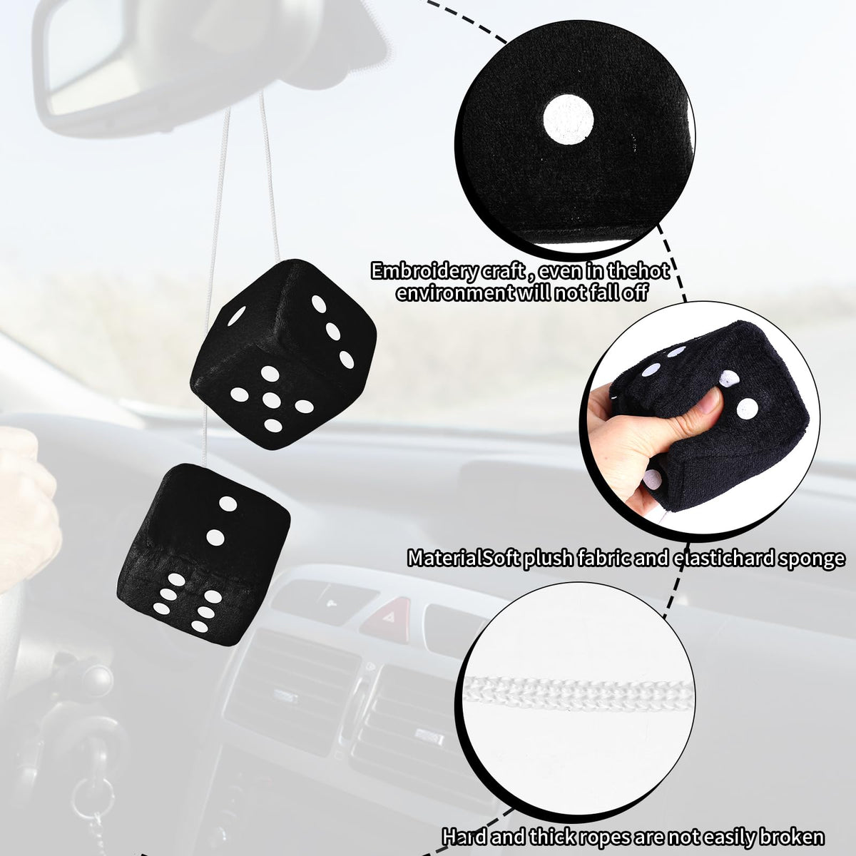 Q: Are the Fuzzy Dice washable?A: Yes, these fuzzy dice are made from 100% washable and breathable materials, allowing you to clean them without worrying about unwanted odors.