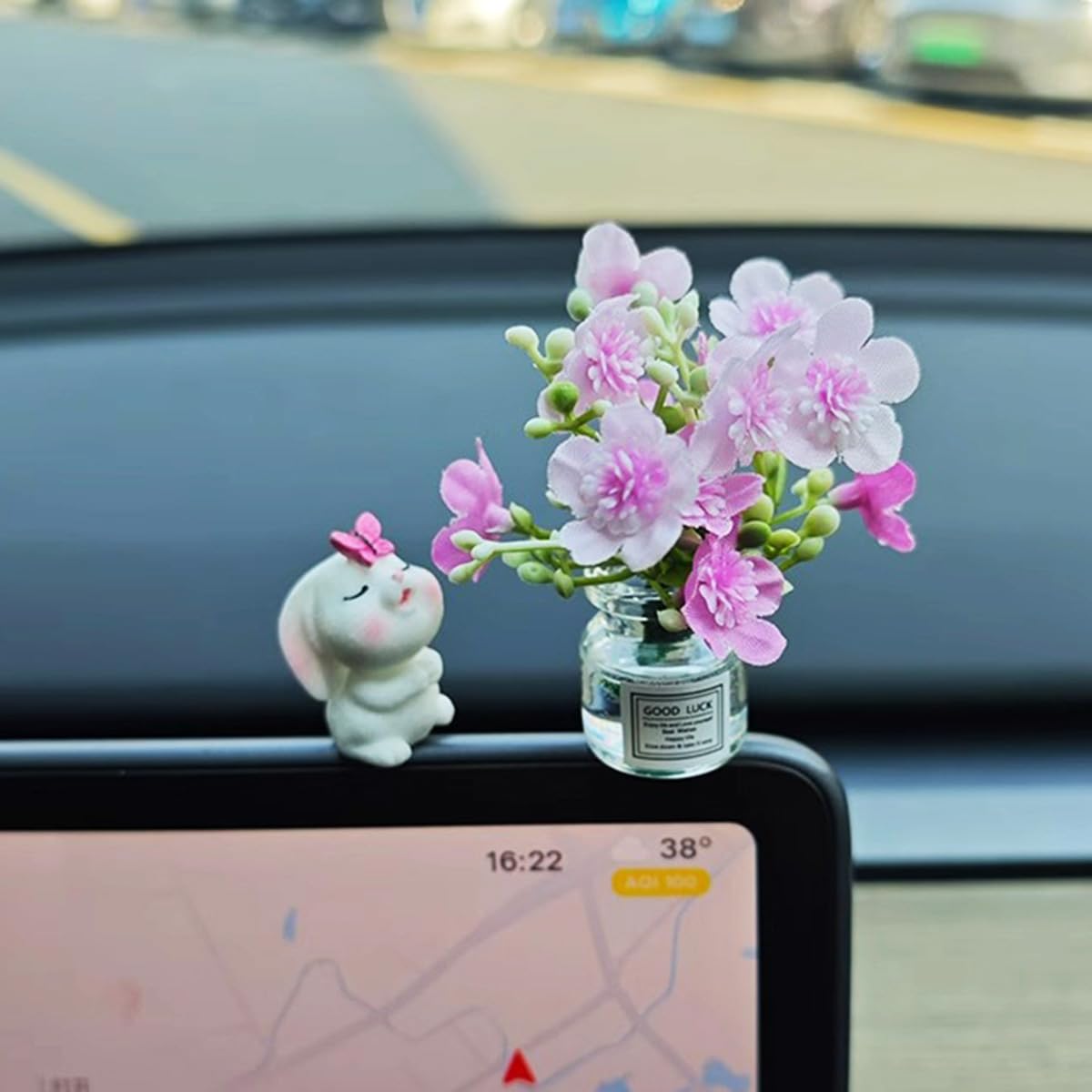 Generic Set Of 2 Cute Mini Bunny And Peach Blossom In Flower Vase Car Rearview Mirror Ornaments Funny Dashboard Decorations Kawa