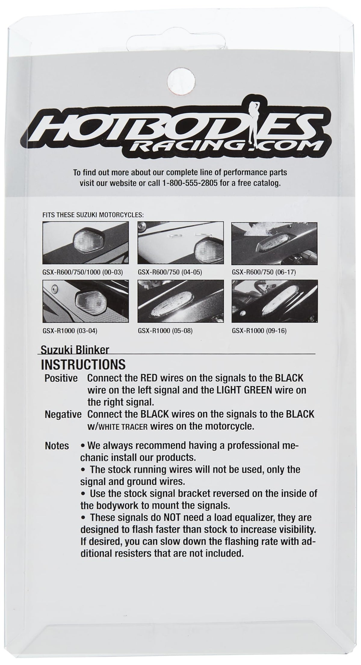 Q: Can I use the Hotbodies LED Blinker Block-Offs with other brands of motorcycles?A: The Hotbodies LED Blinker Block-Offs are specifically designed for certain Suzuki models. While modifications might allow use on other brands, it is recommended to check compatibility for optimal performance and fit.