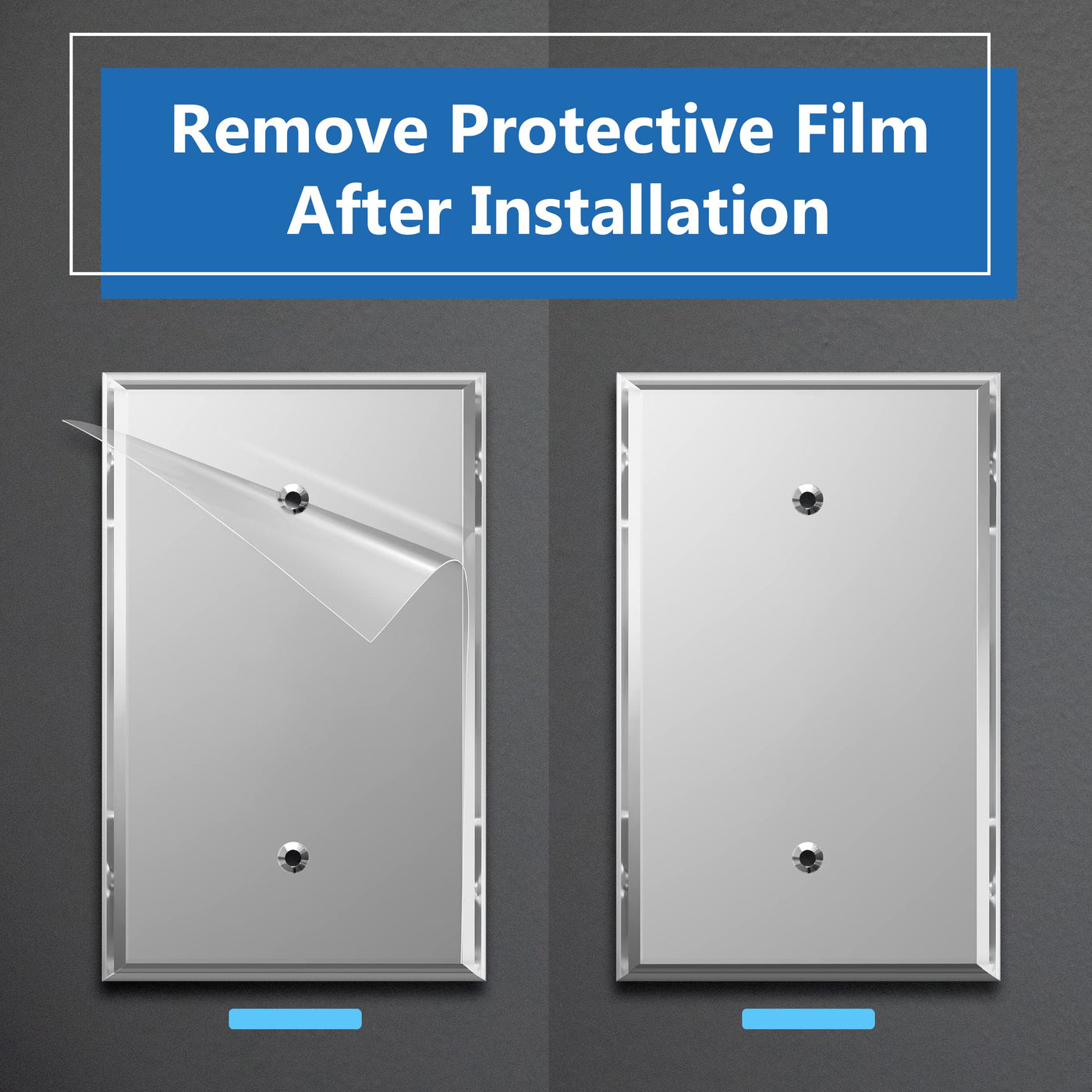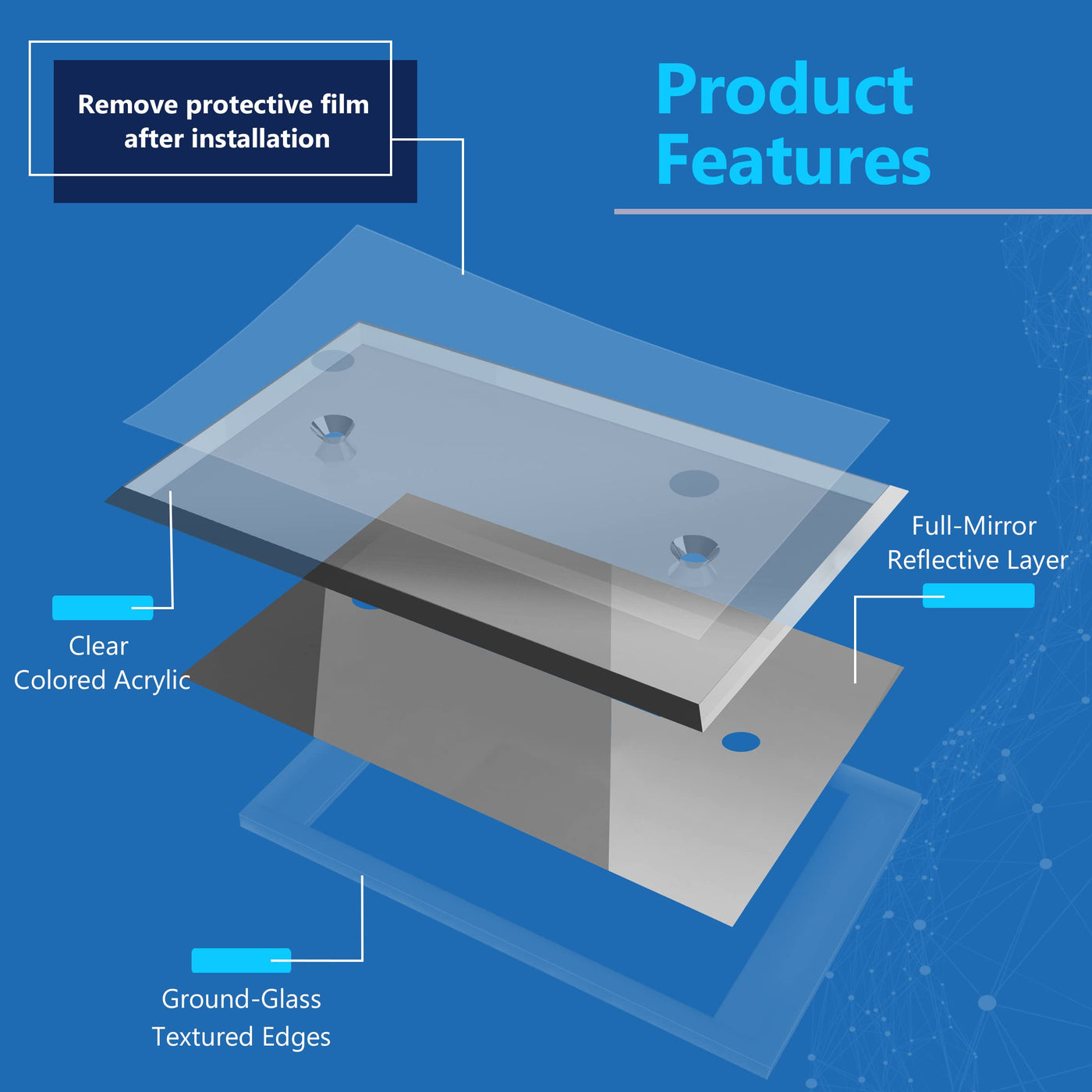 Add a unique flair to your home or business with the LIDER reflective acrylic wall plate. This flashy silver wall plate features a mirrored finish that simply demands attention wherever it is installed. The mirror-like reflective finish is achieved with a thin layer of genuine glass mirror sandwiched between two durable layers of acrylic plexiglass. The result is a three-dimensional mirrored appearance that will instantly upgrade any residential or commercial location. Whether you are looking to spruce up a child’s bedroom or decorate the ultimate dance studio — the acrylic glass wall plate will rise to the occasion and never disappoint. This reflective silver blank wall plate is designed to cover exposed wires or an unused outlet. It is oversized at 5.25” x 3.44”, allowing it to cover more wall space than a standard or mid-size outlet cover would. This acrylic glass wall plate is designed for quick, easy replacements, and matching installation screws are included.