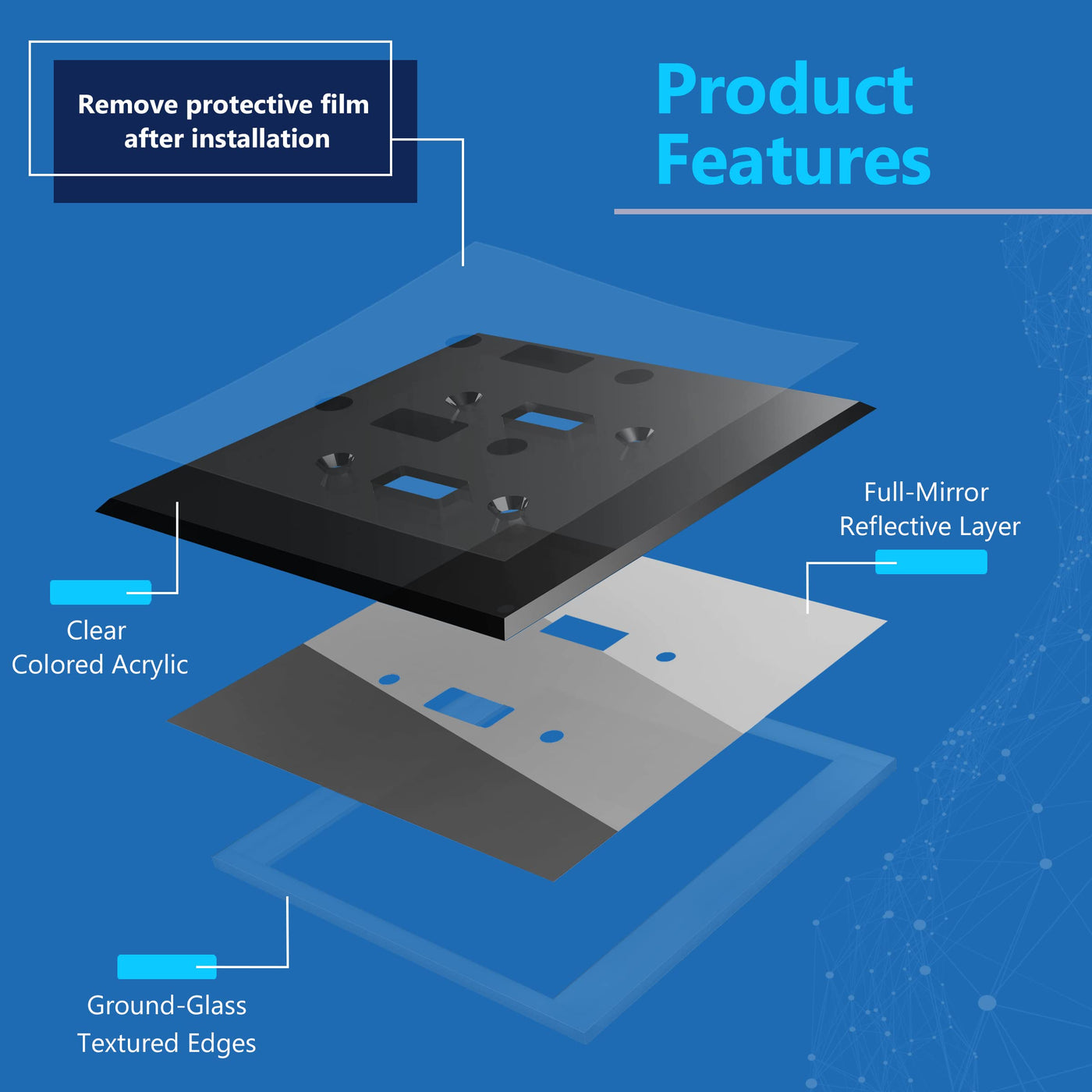 Add a unique flair to your home or business with the LIDER reflective acrylic wall plate. This flashy silver wall plate features a mirrored finish that simply demands attention wherever it is installed. The mirror-like reflective finish is achieved with a thin layer of genuine glass mirror sandwiched between two durable layers of acrylic plexiglass. The result is a three-dimensional mirrored appearance that will instantly upgrade any residential or commercial location. Whether you are looking to spruce up a child’s bedroom or decorate the ultimate dance studio — the acrylic glass wall plate will rise to the occasion and never disappoint. This reflective silver wall plate is designed for double-gang toggle switches or rotary dimmers. It is oversized at 5.25” x 5.25”, allowing it to cover more wall space than a standard or mid-size outlet cover would. This acrylic glass wall plate is designed for quick, easy replacements, and matching installation screws are included.