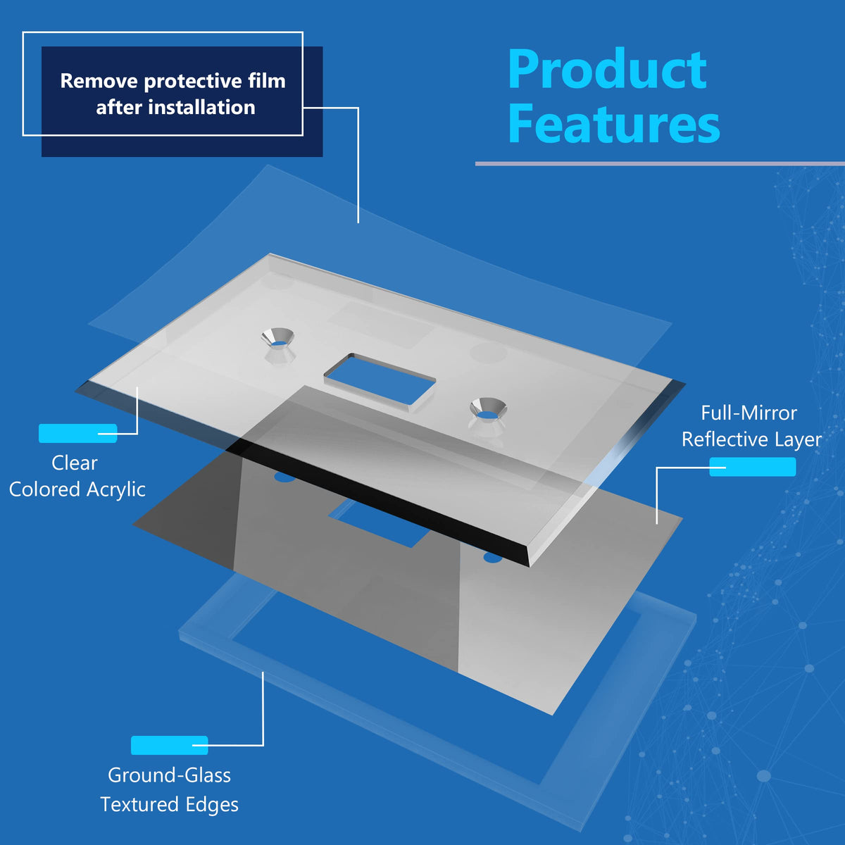 Q: Is the LIDER wall plate suitable for outdoor use?A: While the LIDER Reflective Acrylic Wall Plate is designed for durability and can withstand temperatures up to 140℉, it is primarily intended for indoor use. For outdoor applications, it's recommended to choose wall plates specifically designed for weather resistance.