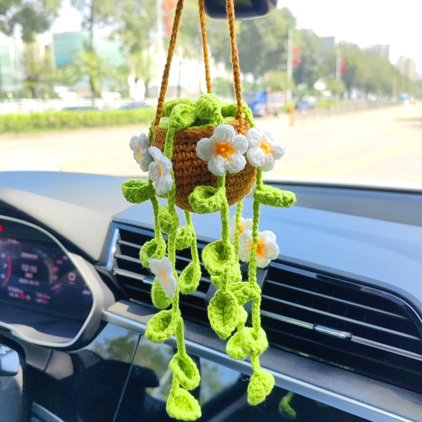 Motaney Potted Plants Crochet Rear View Mirror Accessories, Hand Crocheted (Glue Free) Safe Car Hanging Ornament, Car Mirror Han