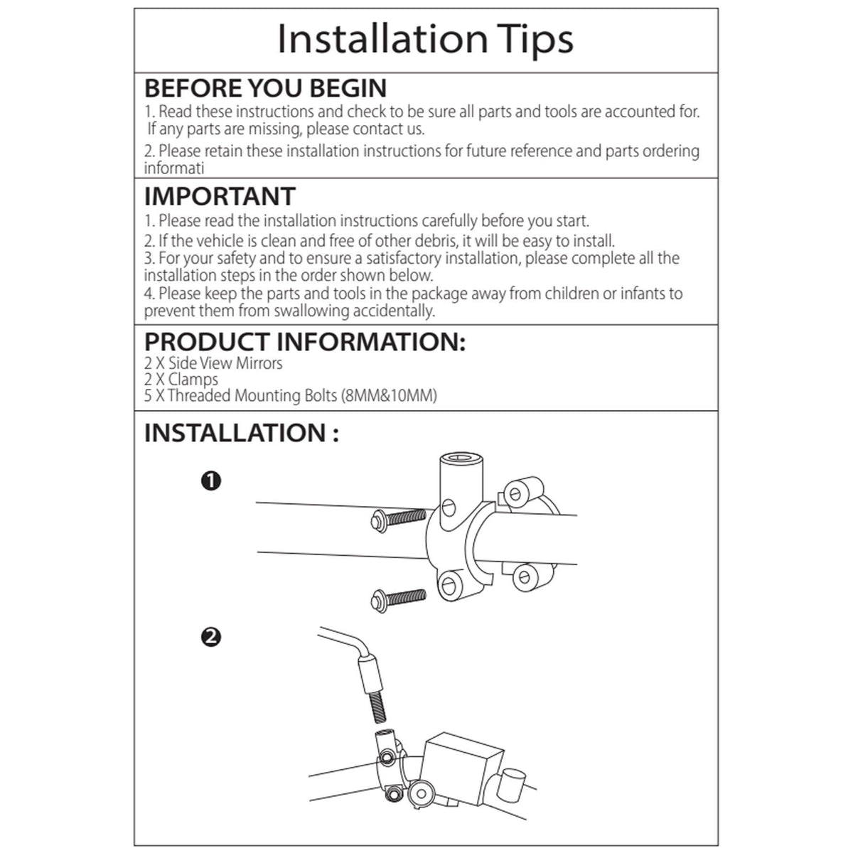 Q: How do I install the ATV side mirrors?A: Installation of the ATV side mirrors is straightforward. Please refer to the second product image for the installation manual, which provides step-by-step instructions to ensure a secure fit.