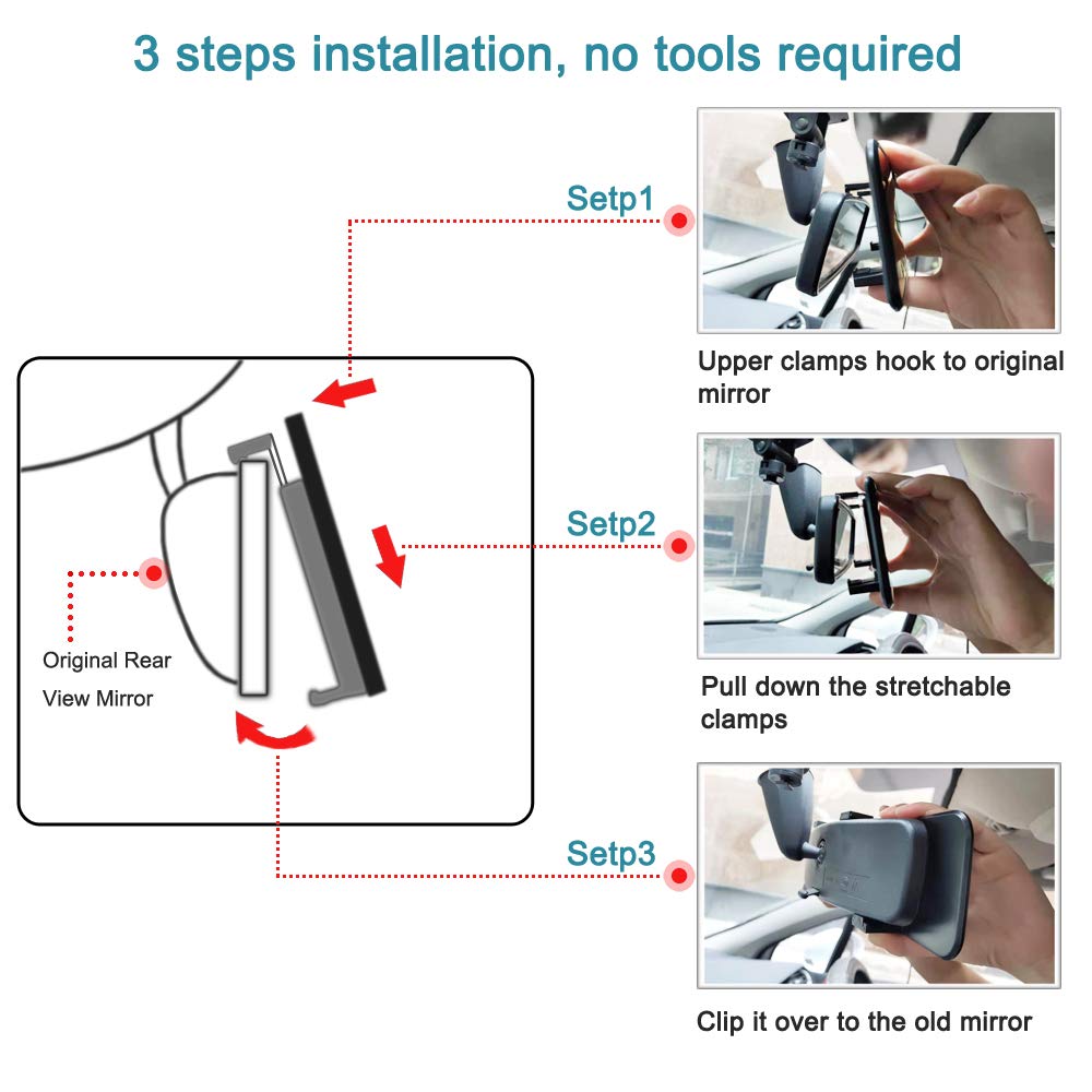 SkyropHD new frameless design rear view mirror is a combination of beauty and safety, it maximizes your view, provides more wide-angle vision to see everything behind and around you | Made of high-definition glass and coated with blue anti-glare tint, SkyropHD car rearview mirror can filter out sunlight at daytime and prevents high beams from bothering you at night | With sturdy clamps the rearview mirror can be easily clip on your original mirror; it won’t shake, wiggle or vibrate while driving or fall off even on bumpy roads | This panoramic rearview mirror is widely suitable for most cars, SUVs, vans and trucks; original mirror that is less than 0.7” in thickness and 3.1” in height will fit without problem | High-quality glass and anti-splash technology make sure the rearview mirror will not fly out even it's heavily stricken or broken