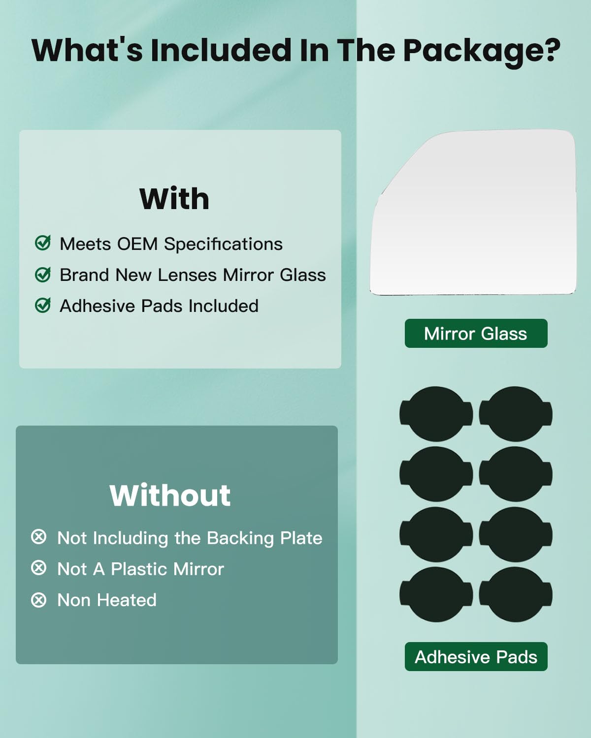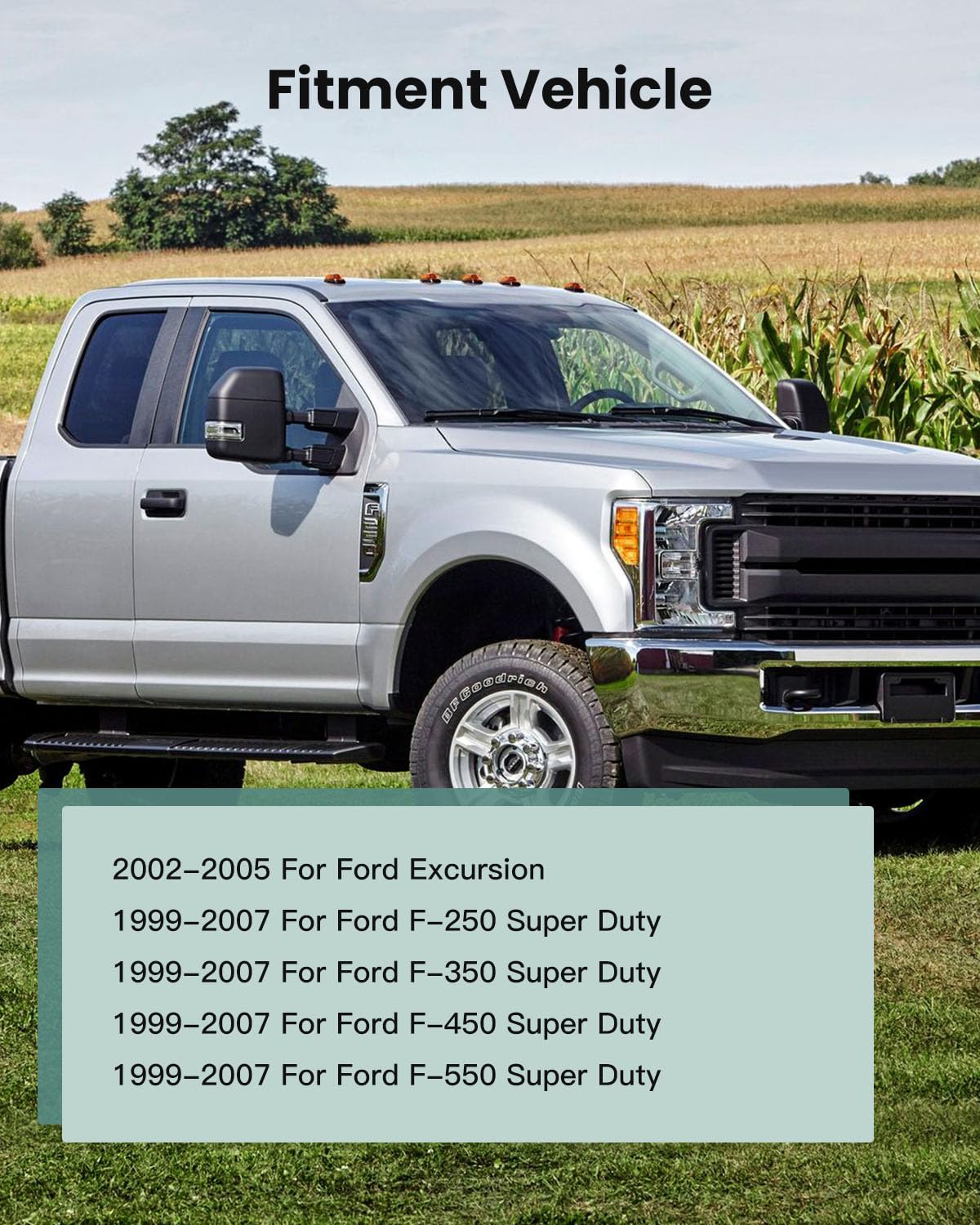 [Tow Mirror Glass Fitment]: Compatible with 2002 2003 2004 2005 For Ford Excursion,1999 2000 2001 2002 2003 2004 2005 2006 2007 For Ford F250 Super Duty,1999 2000 2001 2002 2003 2004 2005 2006 2007 For Ford F350 Super Duty,1999 2000 2001 2002 2003 2004 2005 2006 2007 For Ford F450 Super Duty,1999 2000 2001 2002 2003 2004 2005 2006 2007 For Ford F-550 Super Duty | [Functions]: This Towing Mirros is Equiped with Manual Adjustmet,Left Side Upper Flat Glass,Non-heated,No Arrow Lights,No Plastic Backing Plate,With Adhesive Pads | [Tow Mirror Package Include]: Left Upper Flat Glass,8.03*6.69 | [Easy To Installation]: (1)disassemble the fixed screws of the plastic plate from the car with a screwdriver.(2)disassemble the plastic plate to see the rear view mirror and door screws, use a screwdriver to disassemble the screws.(3)install the new rear view mirror through the window and lock the door screw, then move the plastic plate to the original.(4)after the installation is finished, one of the most important things is to adjust the angle of the mirror,don