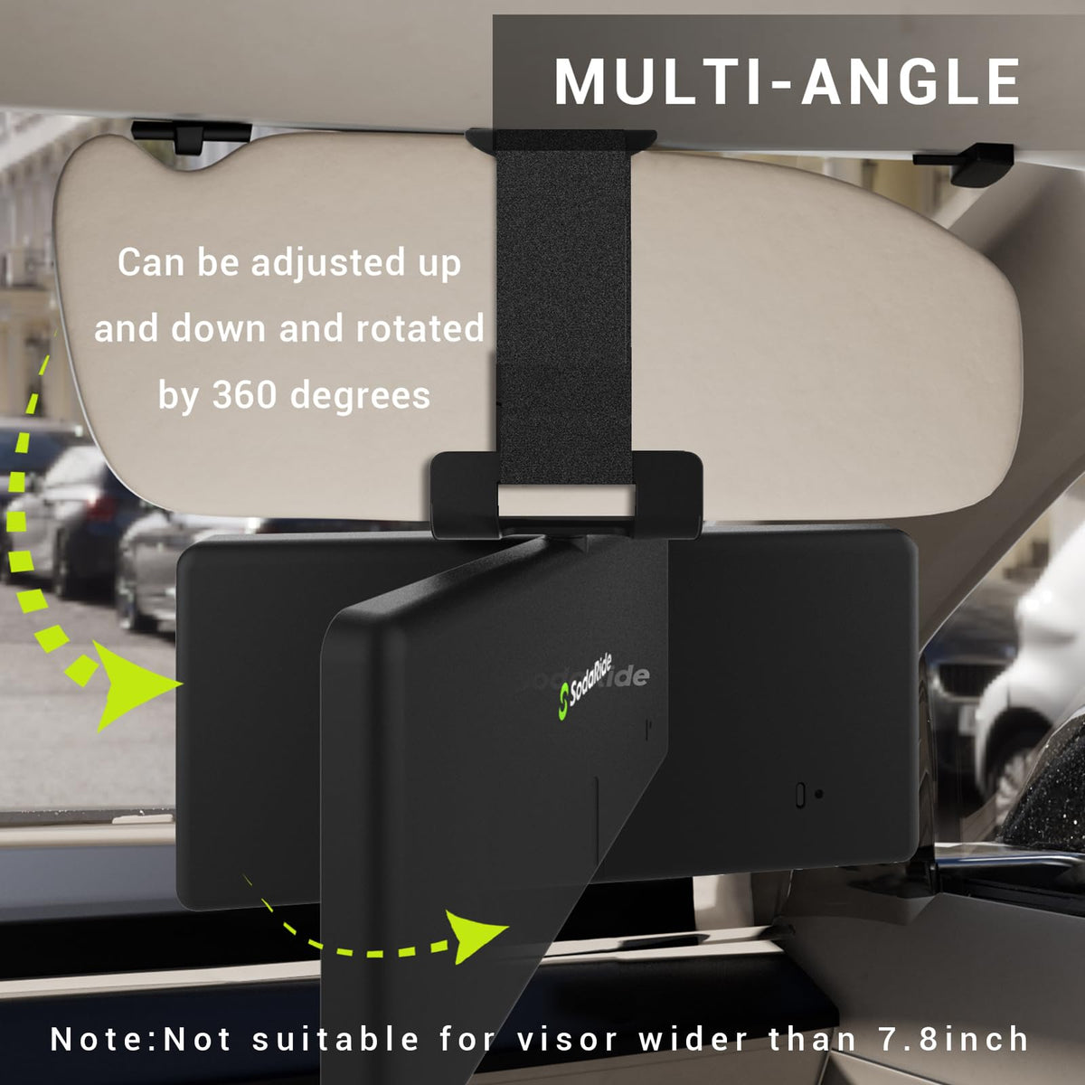 Q: How do I adjust the angle of the SodaRide Car Sun Visor Vanity Mirror?A: The SodaRide Car Sun Visor Vanity Mirror features a patented neck protection design that allows you to pull it down, adjust it to your comfortable angle, and rotate it 360° for optimal positioning while you apply makeup.