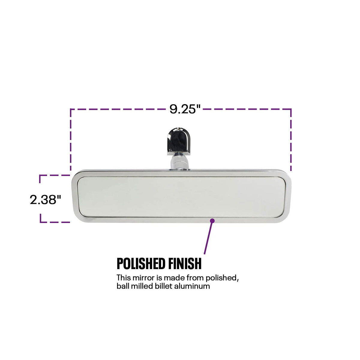 Q: What are the dimensions of the Speedway Motors Polished Ball Milled Billet Aluminum Interior Rear View Mirror?A: The dimensions of the mirror are 9.25 inches wide and 2.38 inches tall, making it a compact yet effective choice for enhanced visibility.