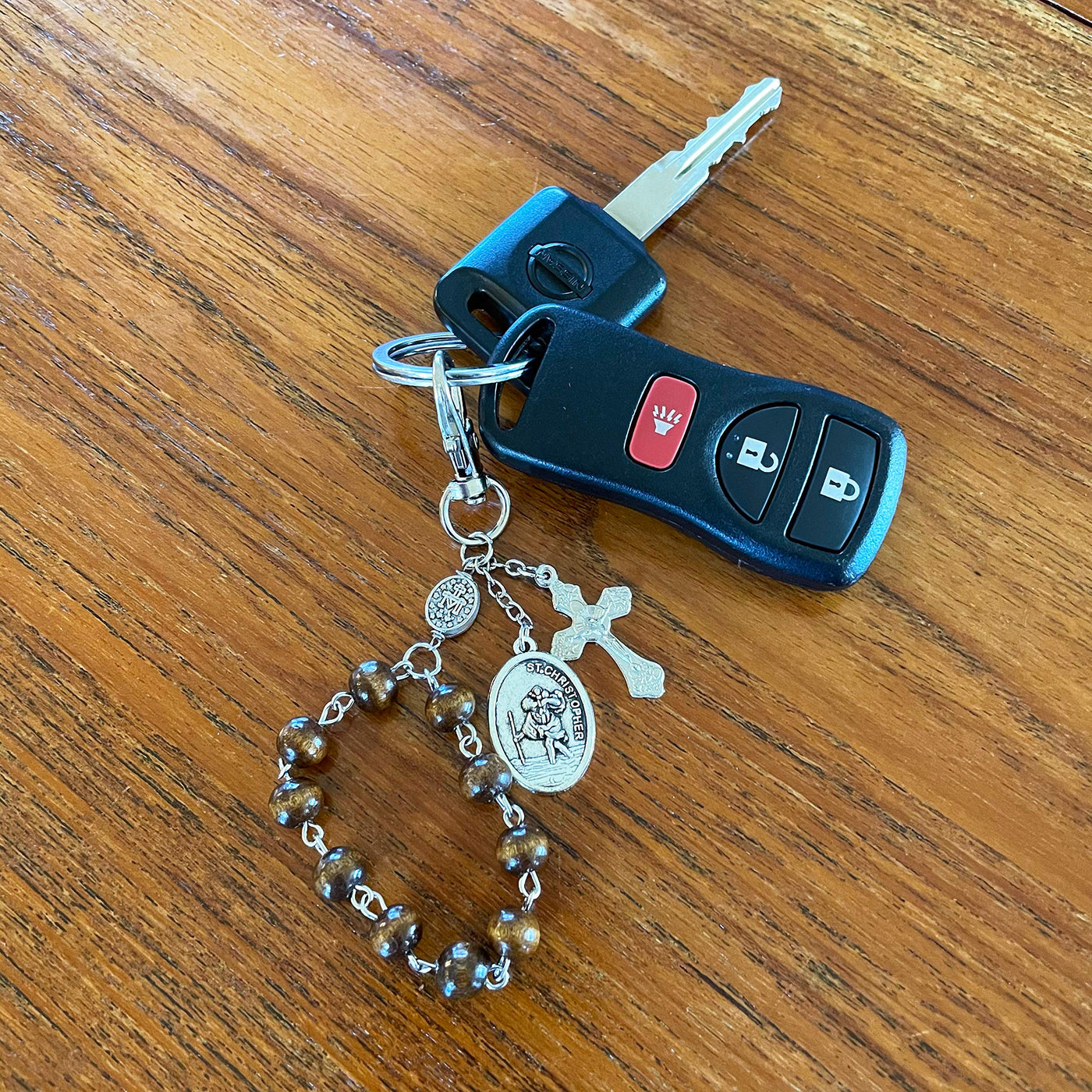 St Christopher is the patron saint of travelers including drivers. A Saint Christopher medal for your car is believed to protect drivers and passengers from harm. This one decade rosary includes a Saint Christopher medal, crucifix dangle and lobster clip so that it can be attached to your rearview mirror or sun visor. It also makes a great St Christopher keychain or can be clipped to your purse or bag.