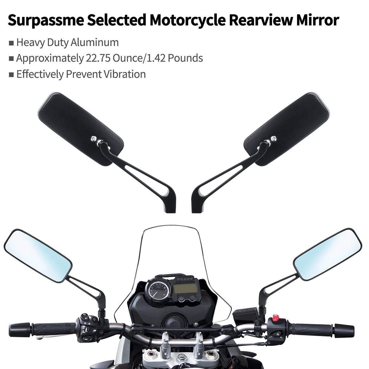 Q: What are the benefits of using the surpassme 8mm/10mm Motorcycle Bobber Mirrors?A: The surpassme Motorcycle Bobber Mirrors feature blue anti-glare glass that effectively reduces glare from oncoming headlights, enhancing your visibility and safety while riding. The high-quality billet aluminum construction ensures durability, while the stylish black housing adds an aesthetic appeal to your motorcycle.