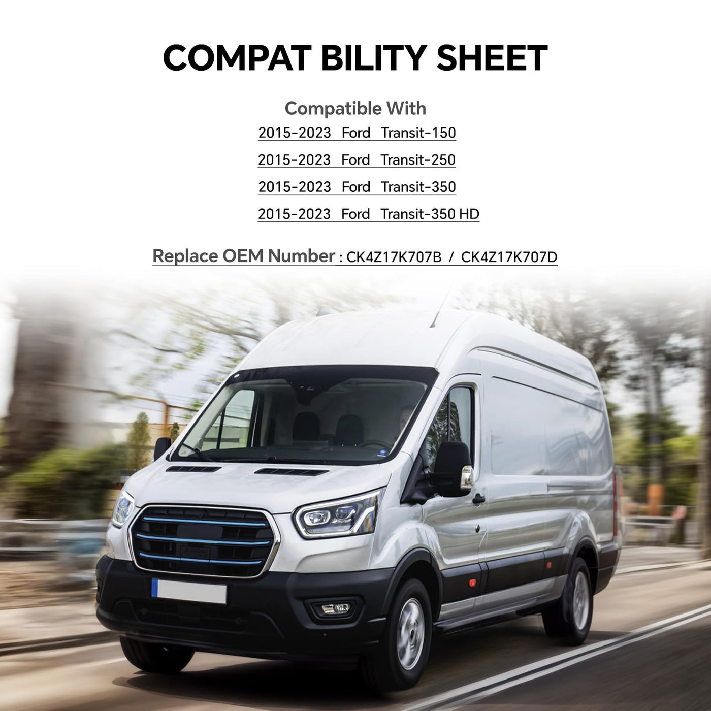 Q: Is this rearview mirror compatible with all Ford Transit models from 2015 to 2023?A: Yes, this TOP-MAX Driver Left Side Upper Rearview Convex Heated Mirror Glass is compatible with Ford Transit models 150, 250, 350, and 350 HD from 2015 to 2023.