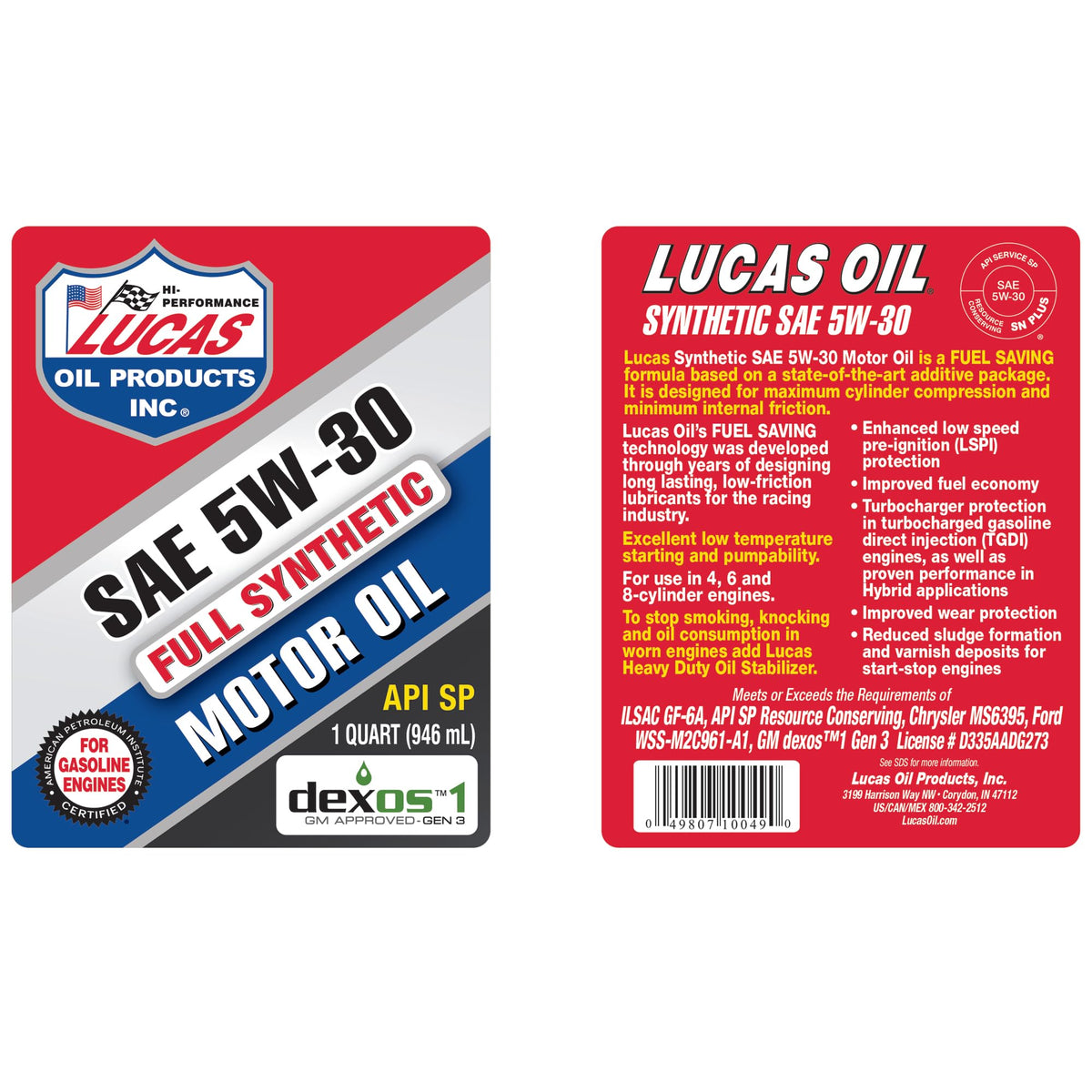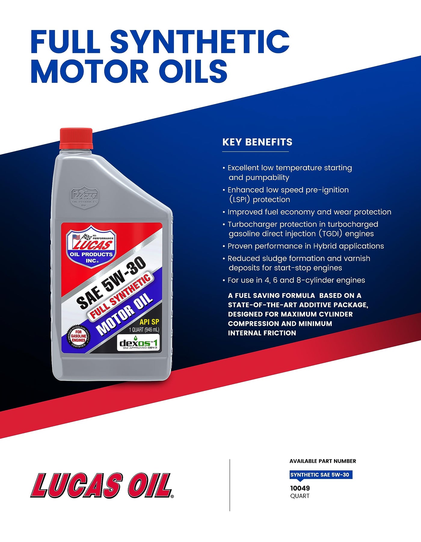 Product DescriptionLucas Synthetic High Mileage Motor Oils are an excellent product that provides the consistent viscosity needed for precision ET racing. They are blended with an exclusive additive package that includes lubricity agents and anti-seize agents that control drag like a zero weight oil and protect metal like a heavy multi-viscosity oil. They are excellent for normal highway usage. For more specific information on each oil please review our product specification sheets.Amazon.comMotor oil is made from crude oil and is used to lubricate, clean, and cool engines. Types of motor oil include conventional, synthetic, diesel, bio-based, hybrid (blends of conventional and synthetic), and recycled oils. Motor oil varies in weight and viscosity, as well as additives that some manufacturers add to the oil during the refining process. A numerical code system created by the Society of Automotive Engineers (SAE) grades motor oils according to viscosity--the higher the number between 0 and 60, the more viscous (thicker) the oil is. Most consumer motor oils are graded by two numbers, with the first number indicating cold weather (Winter or ''W'') performance. SAE 5W-30This oil has a weight of SAE 5W-30, meaning it has an SAE viscosity rating of 5 in cold temperatures and a rating of 30 at normal operating temperature. Always check your vehicle's owner's manual to verify that this is the correct weight of motor oil for your vehicle. Full Synthetic OilThis oil is a full synthetic oil, meaning crude oil is not used in making it. Synthetic oil can be used in vehicle engines instead of motor oils refined from crude oil, and often provides superior mechanical performance over traditional motor oil, including increased gas mileage and reduced engine wear at extreme temperatures. Its complex method of production means it can often cost more than conventional motor oil.