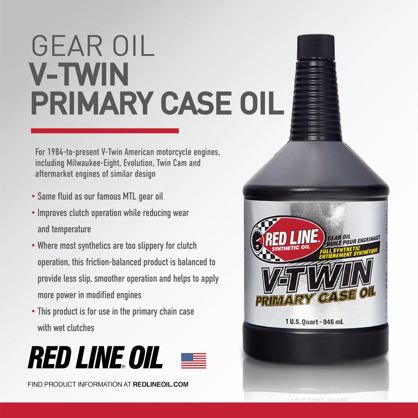 Red Line's V-twin primary case oil is designed specifically for 1984-to-present V-Twin American motorcycle engines, including aftermarket engines of similar designs. Similar to Red Line MTL, this product is for use in the primary chain case with wet-diaphragm spring clutches. Designed to operate over a wide temperature range, V-twin primary case oil improves clutch operation, while reducing wear and temperature. Where most synthetics are too slippery for clutch operation, this friction-balanced product is designed to provide less slip, smoother operation, and more power in modified engines