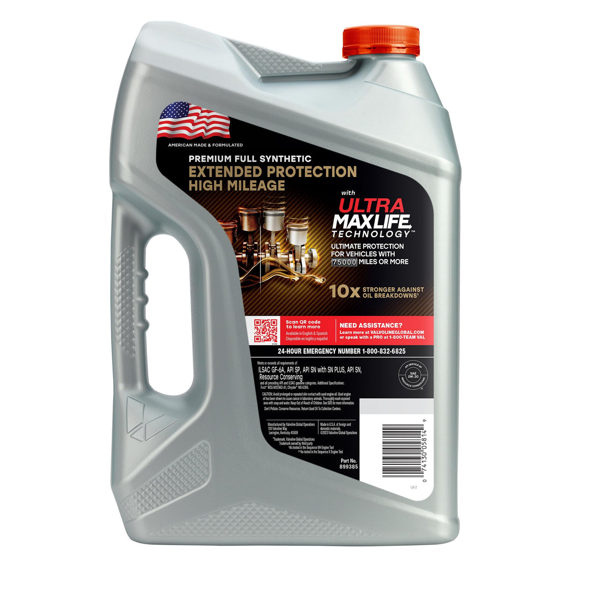 Valvolines best motor oil now features a formulation with Ultra MaxLife Technology, offering the ultimate protection for vehicles with more than 75,000 miles. Valvoline Extended Protection Full Synthetic High Mileage 0W-20 Motor Oil is designed with premium seal conditioners to rejuvenate aging seals and prevent oil leaks. Proven to maximize engine life, its 10X stronger against oil breakdown and provides up to 50% greater wear protection than industry standards. Plus, our Dual Defense Additive Technology has a fortified blend of detergents to minimize deposits, sludge and corrosion that can rob your engine of horsepower and fuel efficiency. Like all Valvoline full synthetics, its 24X stronger against engine-killing contaminants than the leading full synthetic. If you demand peak performance from your high mileage Honda, Chevrolet, Ford, Toyota or any vehicle with more than 75,000 miles, Valvoline Extended Protection Full Synthetic High Mileage can help your engine run smoother, last longer, and possibly improve fuel efficiency. Available in multiple viscosities including SAE 0W-20, SAE 5W-20 and SAE 5W-30.
