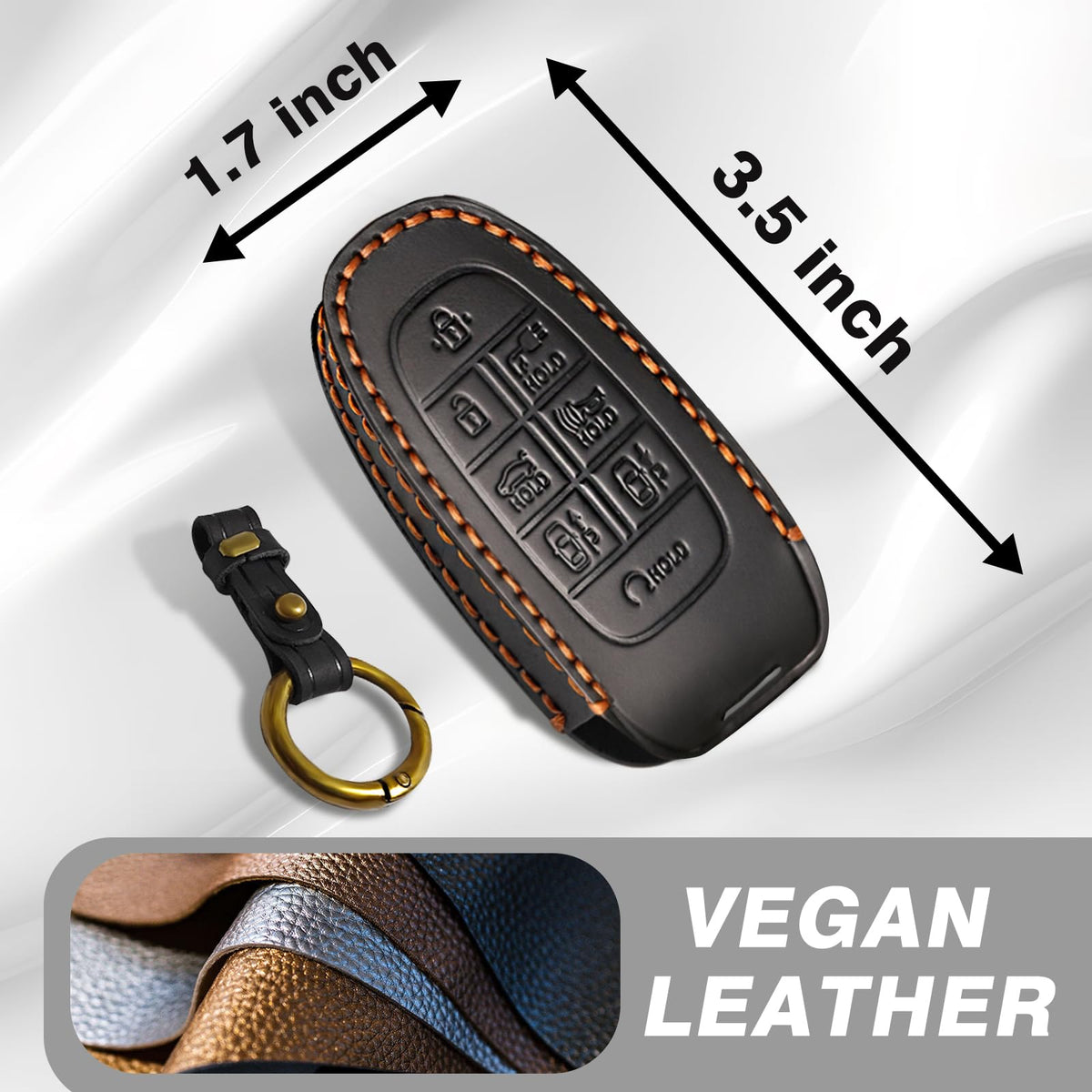 Q: What material is the key fob cover made of?A: The key fob cover is made of high-quality vegan leather, which is designed to be fadeless, impact-resistant, and provide a stylish appearance.