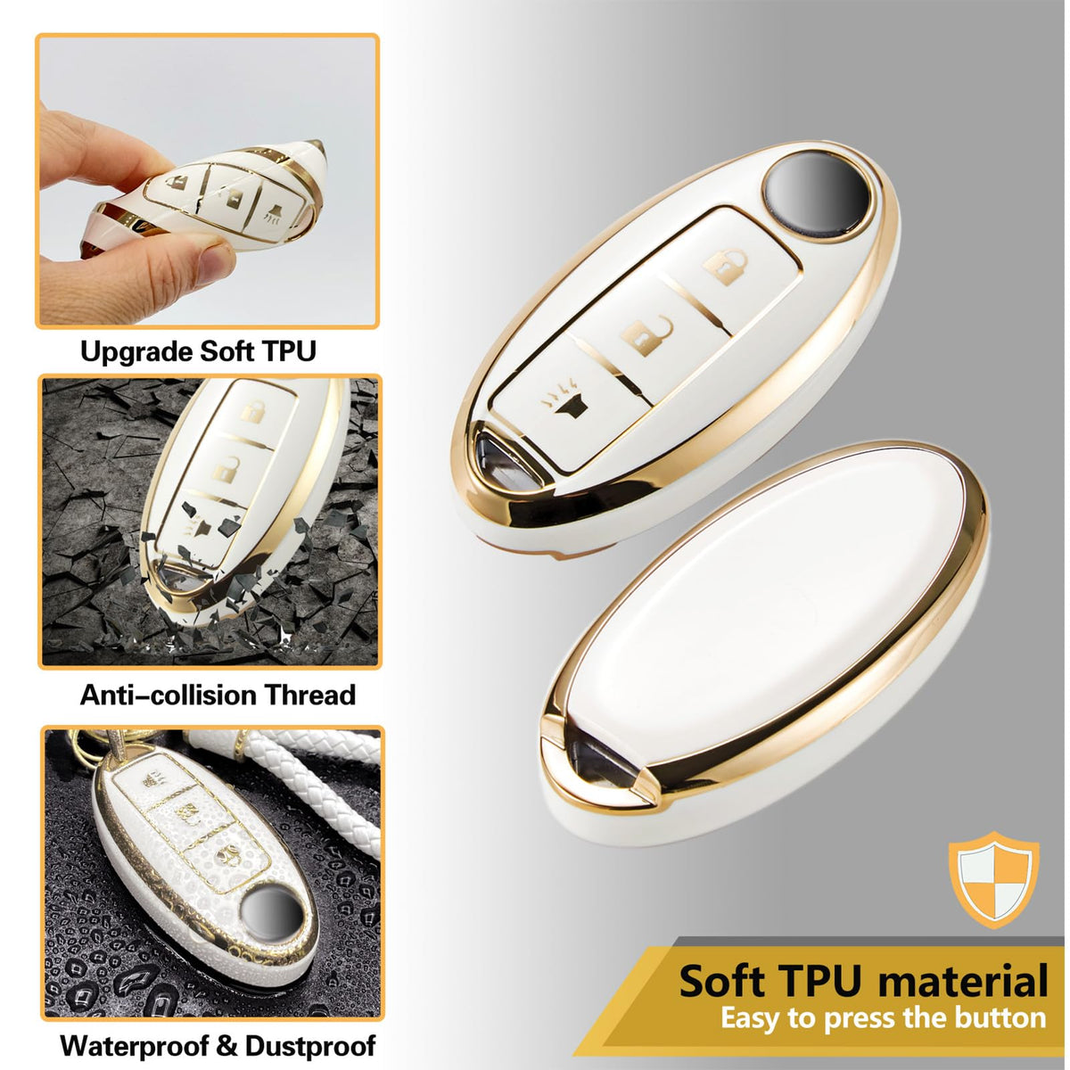CTRINEWS for Nissan key fob cover is made of high quality thermoplastic polyurethane (soft TPU), fits keyless entry smart key type for Altima Maxima Murano Armada Sentra Rogue Pathfinder INFINITI EX FX QX (3 Button only) Keyless Smart Key Fob. It can effectively prevent you key from scratches, broken,cracks. The surface leather grain,leather Keychain and different colors available can make your key very eye-catching and personalized.