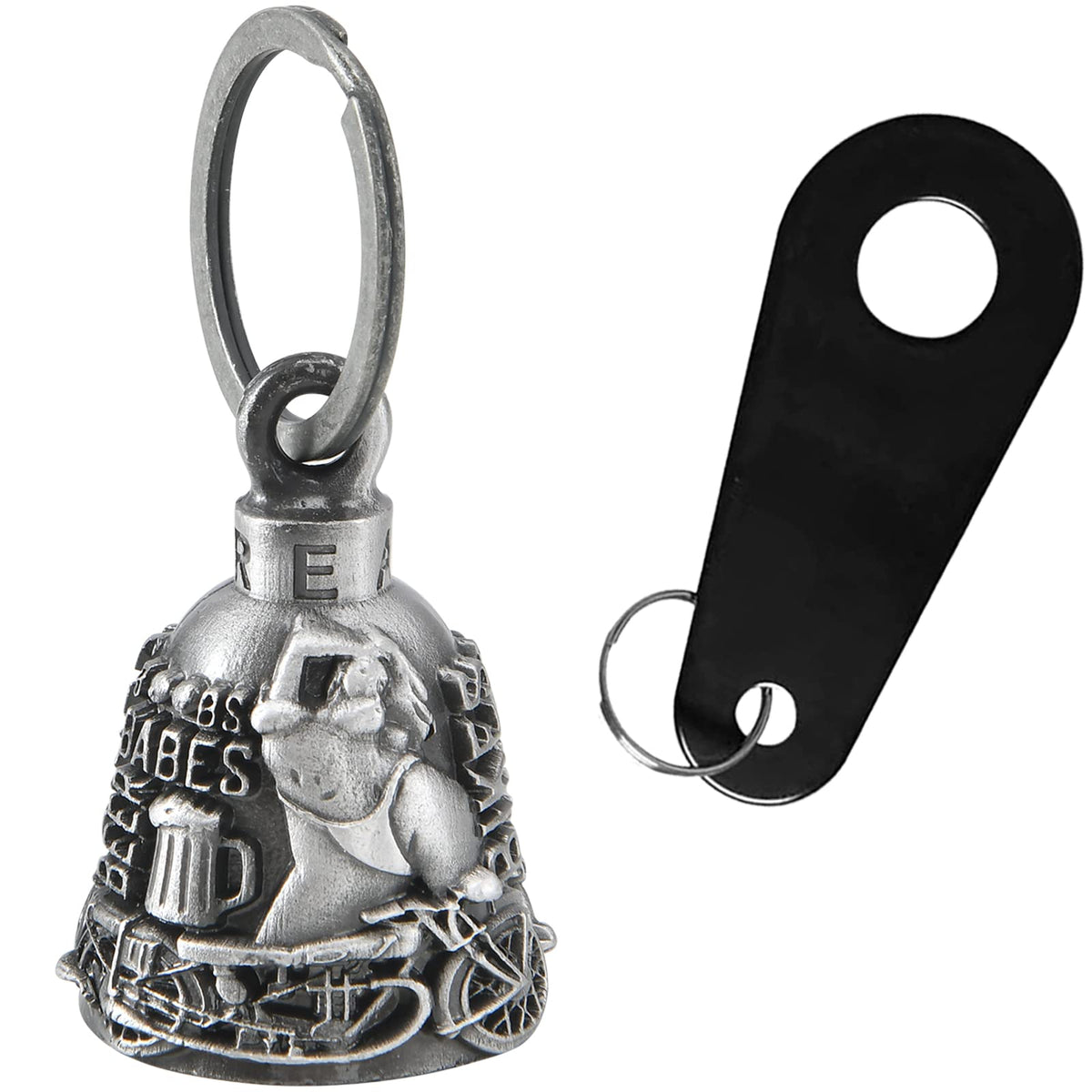 [Heavy Duty & Good Details] - Made of heavy and quality metal, the thick bells for motorcycles are durable and built to last for years. Quality material, zinc alloy, makes bells impact resistant, wear-resistant, environmental and non-toxic. The motorcycle bell is weather resistant, can withstand the open road's rigors and long rides. The biker bell decorated with 3-D relief is exquisite. Embossed details on bells are clean and visible. | [Unique Design & Good Looking] - The motorcycle bell with good finish features unique design and beautiful looking. These patterns on bells are nicely detailed. Beautiful appearance makes the bell special and allows you to show your personalized style. The little bell with an open-ended shape is easy to store. With loud and delightful ringing, the bell accompanies riders all the way. Attached to the bottom of motorcycle or used as a key chain. A great addition on motorcycles. | [Road Protection & Good Luck] - According to the legend behind these motorcycle bells, the bell acts as a charm for good luck. The bells can drive away Evil Road Spirits and Road Gremlins, bring rider protection and keep rider safe on the road. If you buy this bell for yourself, the magic does work. Bell has twice as much power against evil spirits when given as a gift. | [Great Gift Idea] - Meaningful gift for friends, mother, father, wife, husband, girlfriend, boyfriend, daughter, son, granddaughter, grandson, family members, fellow riders, bikers and more. Suitable for birthday, Christmas, Mother's Day, Father's Day, Valentine's Day. Gifting the riding bells to ones you love and care about will not only give them safety and luck, but also show goodwill and how much you care. The bell reminds rider to ride slowly and be safe on the road. | [Dimensions and Package Content] - Measurement of bell: 1.77'' Height x 1.18'' Diameter. Weight: 0.18 LBS. Each bell comes with a 1.18'' split key ring, a drawstring black velvet bag, a black bell hanger and a motorcycle bell legend card. Motorcycle bell is easy to install with bell hanger or zip tie.
