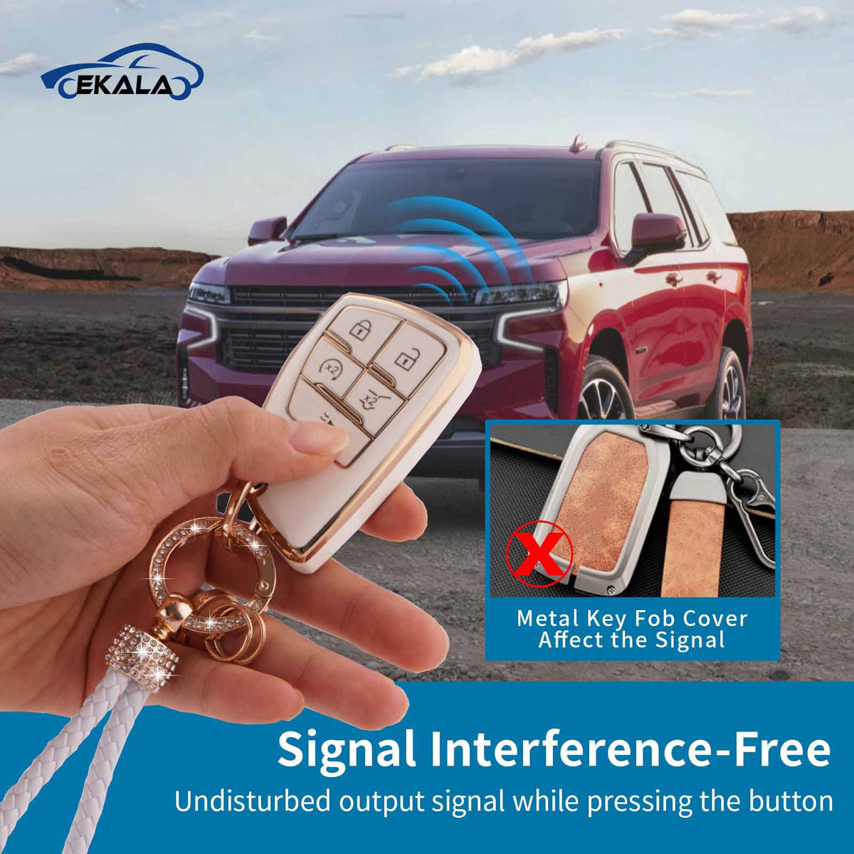 Q: How does the EKALA Key Fob Cover prevent signal interference?A: The EKALA Key Fob Cover is designed with interference-free technology, allowing you to press the buttons on your key fob without any disruption to the signal. This ensures seamless operation of your key fob while it's protected.