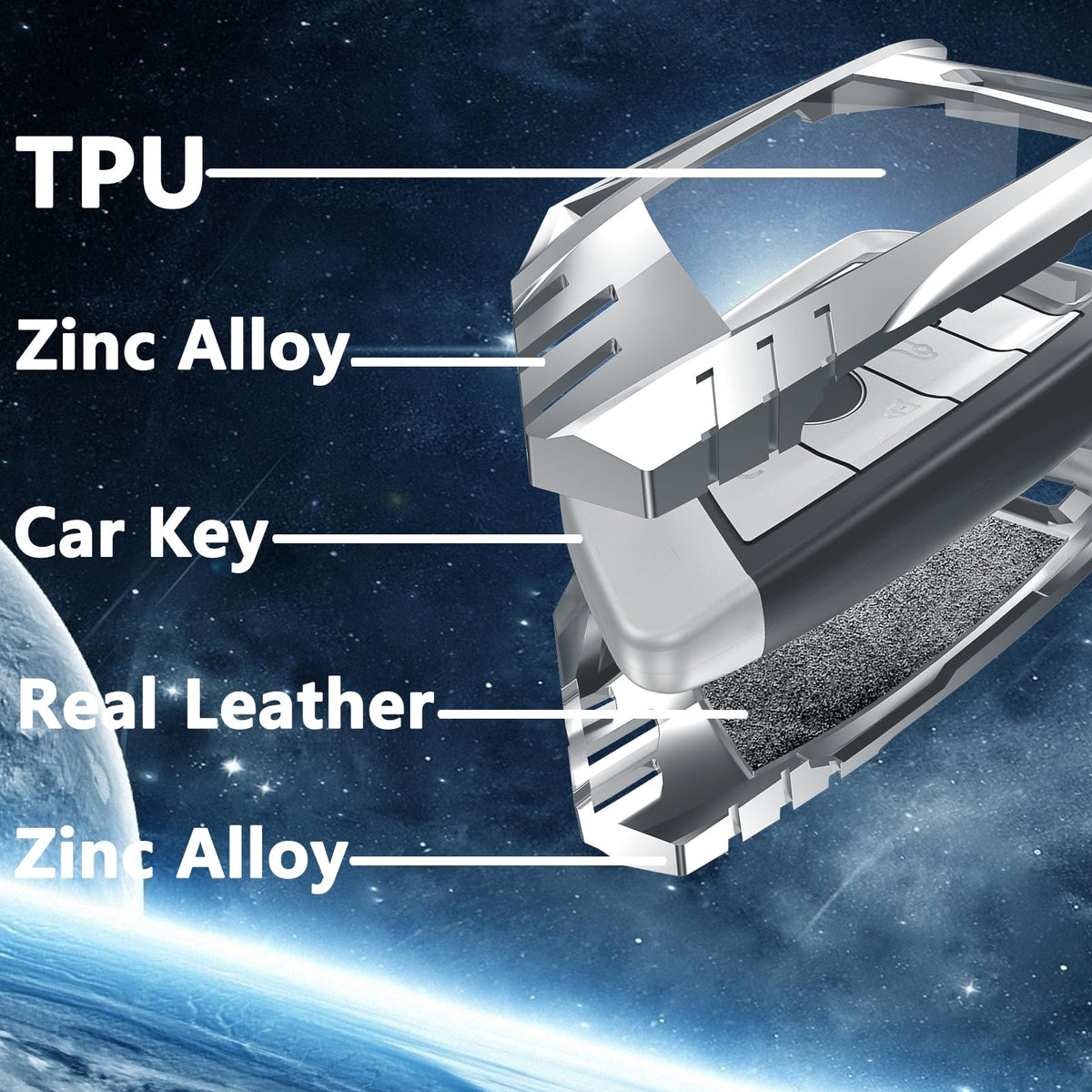 The Ocezbiis key fob cover made with premium TPU,zinc alloy and Real leather.The button position adopts TPU for more convenient and intuitive use of the key. The back is made of genuine leather, providing a better feel and user experience. The overall structure is made of zinc alloy, which can maximize the protection of the key and is resistant to falling and not being damaged.