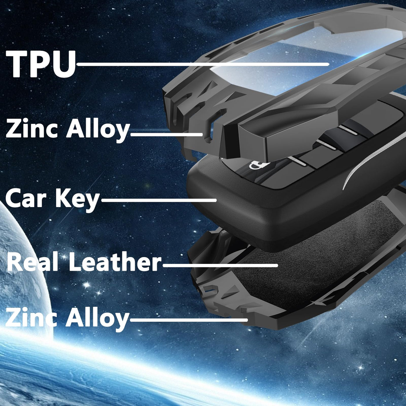 Q: What materials are used in the Ocezbiis key fob cover?A: The Ocezbiis key fob cover is made from premium materials including TPU, zinc alloy, and genuine leather. This combination offers durability, a comfortable grip, and effective protection against drops and scratches.