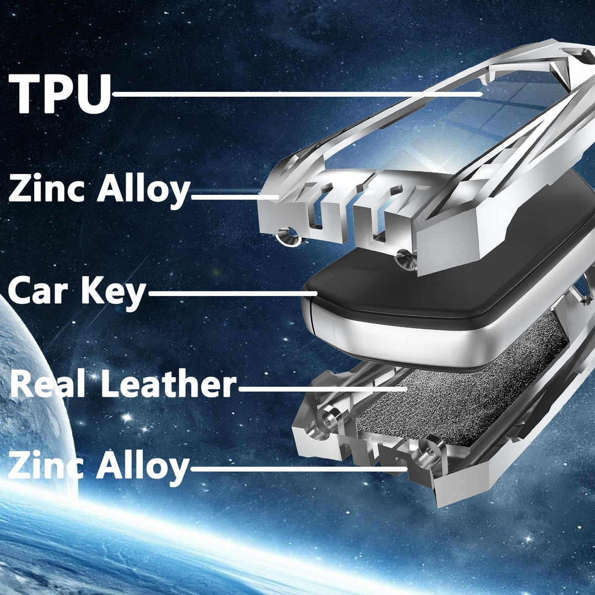 Q: What materials are used in the Ocezbiis key fob cover?A: The Ocezbiis key fob cover is crafted from premium TPU, zinc alloy, and genuine leather. This combination ensures durability, a comfortable grip, and enhances the overall protection of your key fob.