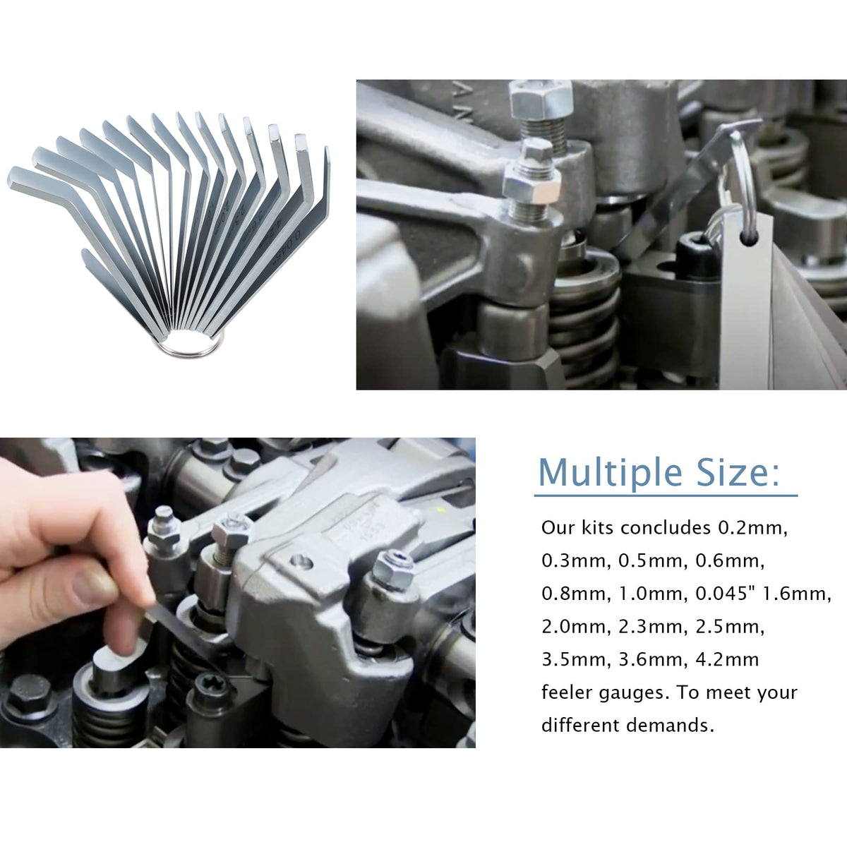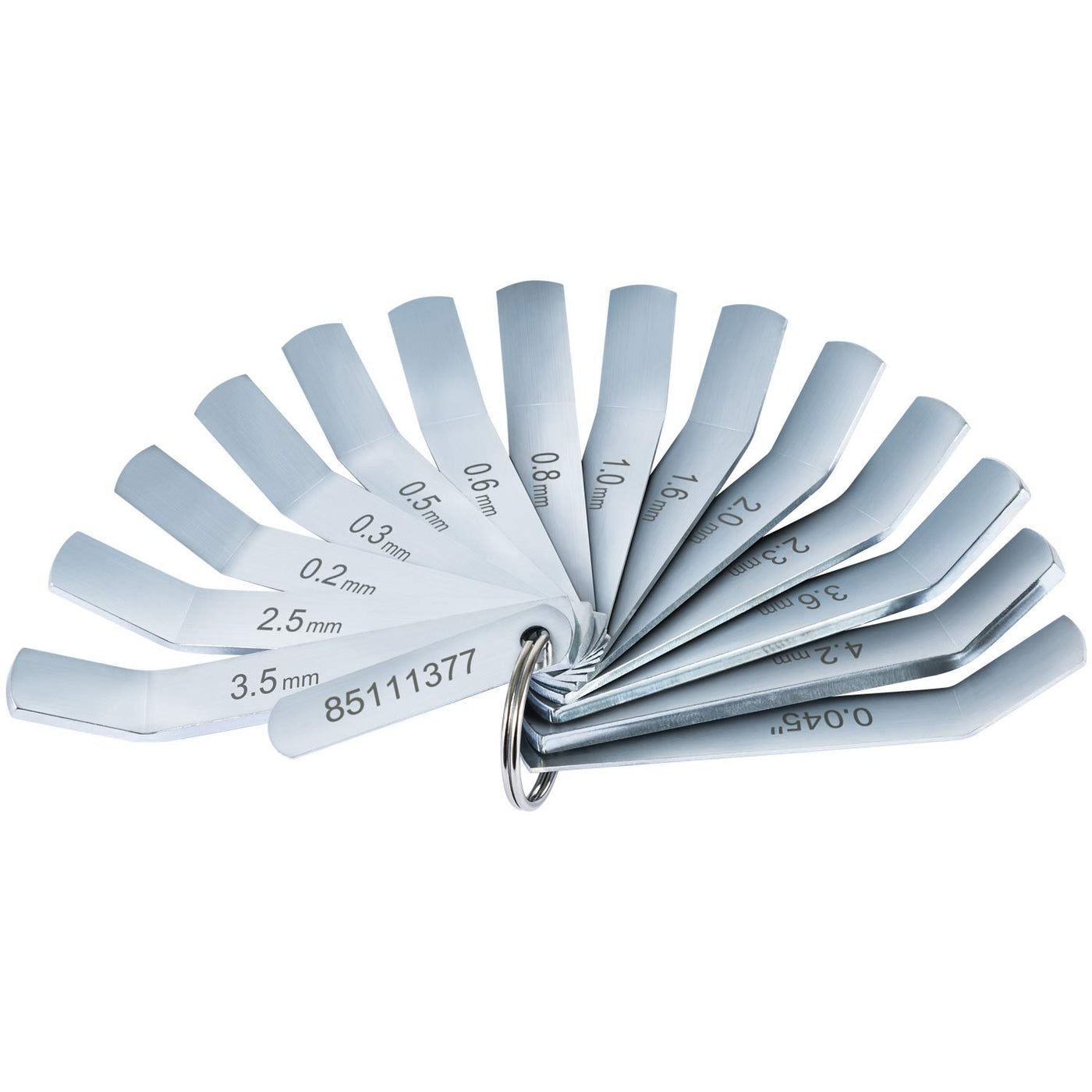 Steps to follow while using the feeler gauge: 1?Unfolding of the Blades - Before using the feeler gauge, you need to remove and unfold the blades from the case. 2?Selection of leaf - Always try to select the leaf that is approximately the same width as that of the gap that you wish to measure. 3?Close back the other leaves - The system of the tool is such that the individual tool leaf can be used. To avoid bending of the other non-operated leaves, they must be folded away while measuring the gap. 4?Proper holding of the gauge - You should hold the gauge in the same manner as you hold the pen knife or multi-tool between your thumb and forefinger. You can measure the gap by adding more than one leaf at a time for extra accuracy. A small leaf of 0.05 mm can be added along with the large leaf. 5?Be tender - Be aware of the force implied on the blades as if the blades are of thinner thickness, then they might bend when pushed into a gap. 6?Feel for a frictional resistance - There is a need for a certain type of frictional resistance while sliding the blade through the gap. It is never recommended to force the feeler gauge into the gap. It might damage the blade of the gauge while measuring the item. It might sometimes happen that the gauge might be stuck in the gap that you are trying to measure. Thus, you can always initiate a slightly thinner gauge blade. In case the gap is larger than the blade, and there is no resistance to a thicker gauge, then you can add additional blades until the resistance feel is correct. There is a need for multiple measurements to confirm the exact size of the gap. 7?Testing of gauge for measurement - When you achieve the proper friction at that time, you will get the correct gap measurement. (It's necessary to correctly implement the tool whenever it is used to getaccurate results.)