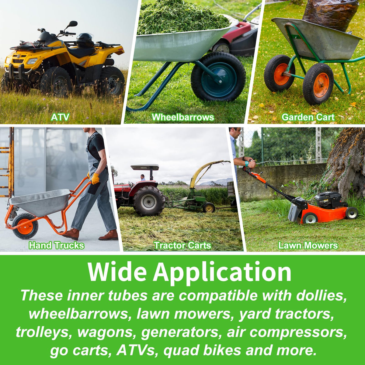 NOTE Not for road/highway use. 30PSI Maximum Only inflate with a manual pump to avoid overfilling. Please check for the details and size to make sure this part will fit. Specification Material: Rubber Measurement: 15x6.00-6'' Feature: Inflatable Ply Rating: 4 Maximum Inflation: 30 PSI Package: 2pcs inner tube 2 Pack 15x6.00-6'' INNER TUBES Suitable for tires with an outer diameter of 15 inches to 15.5 inches, width of 6 inches, and inner diameter (rim diameter) of 6 inches. Aside from lawn mowers and yard tractors, these inner tubes are also compatible with wheelbarrows, dollies, trolleys, yard trailers, wagons, generators, snow blowers, air compressors, go-carts, ATVs, pressure washers, wood chippers, and more. TR13 STRAIGHT VALVE STEM These inner tubes come with a standardized universal T13 straight valve stem MADE FROM HEAVY-DUTY AND HIGH-QUALITY MATERIALS We choose premium rubber for our inner tubes. They are also made 4X thicker and more durable, ensuring excellent performance and maximum longevity. The thick rubber walls of these inner tubes provide maximum vibration and impact dampening effects for a more comfortable and smoother ride over any terrain. EASY TO REPLACE The heavy duty inner tubes are easy to install. It is take around 20min to install the tire tubes. No special tools.