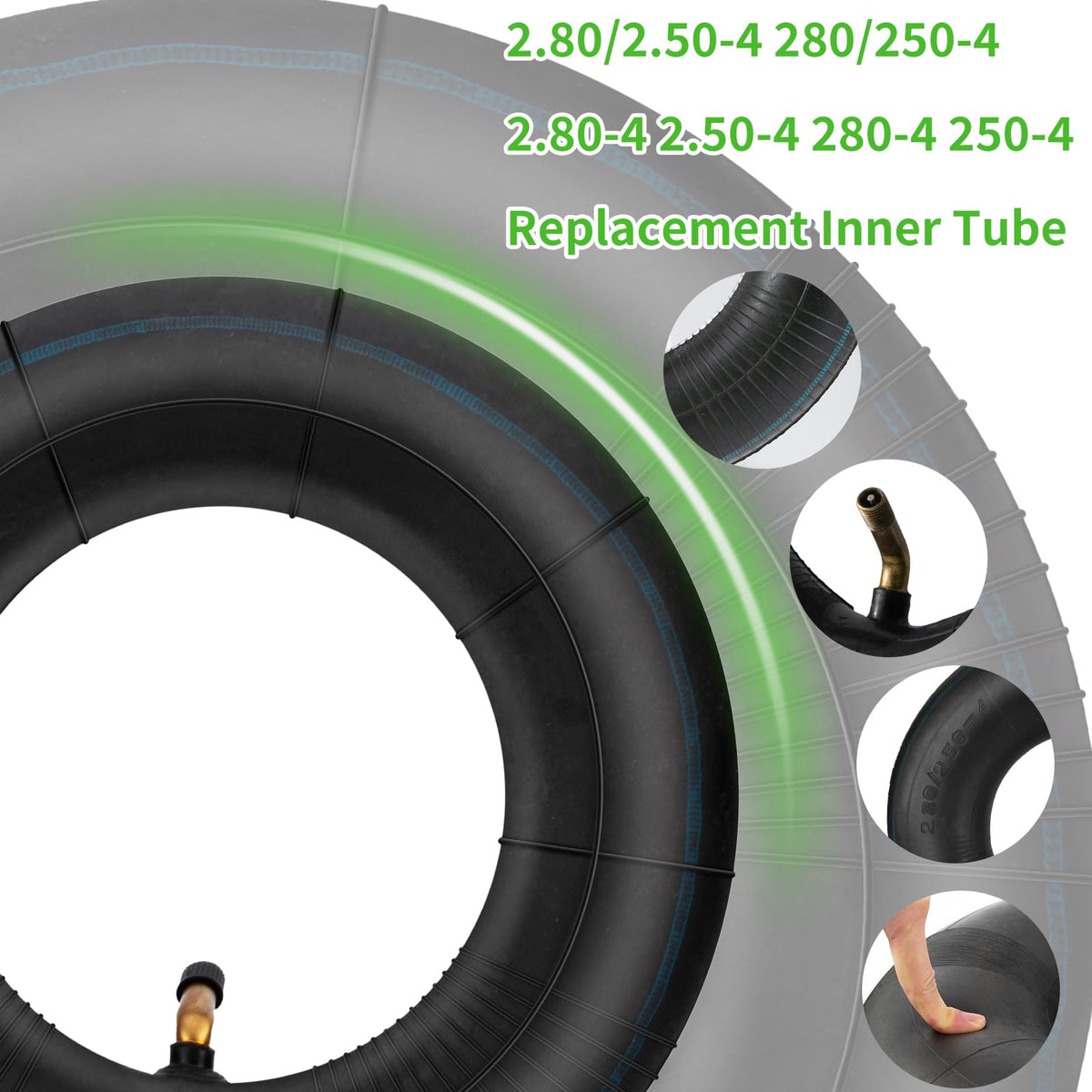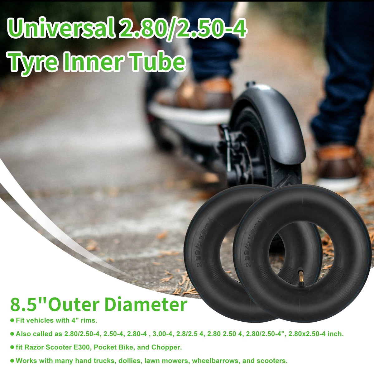 NOTE Not for road/highway use Please check for the details and size to make sure this part will fit. Before installing, check to see if the inner tubes are completely sealed by putting them in water. If any issues, please contact us. FEATURES Perfect Replacement Inner Tube for Tire This replacement inner tubes fit for 2.80/2.50-4 tires/wheels (8.5'' outside diameter). Also called 2.80/2.50-4, 2.50-4, 2.80-4 , 3.00-4, 2.8/2.5 4, 2.80 2.50 4, 2.80/2.50-4'', 2.80x2.50-4 inch. Great Compatibility SPORTYOUTH inner tire tubes are compatible various equipment such as Razor Scooter E300, Pocket Rocket, Chopper, hand trucks, dollies, wheelbarrows, generators, garden carts, tractor, flat carts, lawn mowers, golf cart, yard trailers, trolleys, wagons, generators, snow blowers, pressure washers, air compressors, wood chippers and more. Premium Tube The tire inner tube is made of isobutylene isoprene rubber which is better in air tightness, heat resistance and aging resistance. Easy to Replace The heavy duty inner tubes are easy to install. It is take around 20min to install the tire tubes. No special tools. SPECIFICATION Material: Rubber Measurement: 2.80/2.50-4'' Feature: Inflatable Ply Rating: 4 Maximum Inflation: 30 PSI Package: 2pcs inner tube