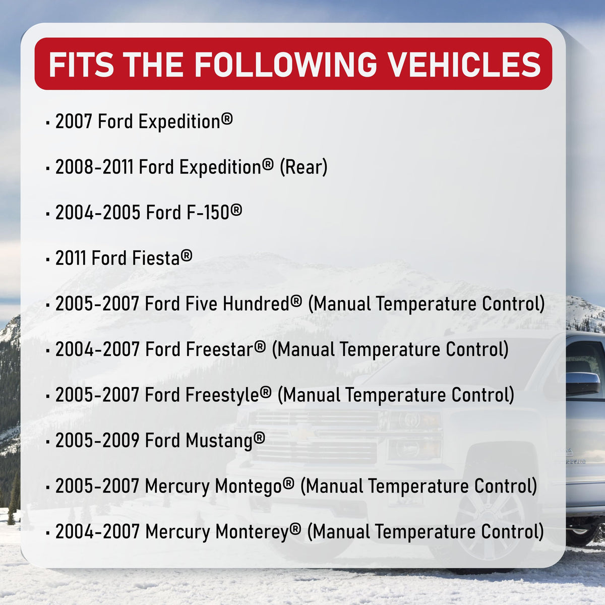 The wiring harness pigtail plug connects the blower motor resistor to the vehicle's electrical system. It allows for control of the blower motor speed ensuring a secure and reliable electrical connection. It can be easily located on the passenger side of the vehicle, behind the glove box, or under the dashboard near the blower motor assembly. Compatible with the Following Vehicles: 2006-2010 Crown Victoria 2008-2014 Escape 2007-2014 Expedition 2007-2010 Explorer 2004-2016 F-150 2011-2013 Fiesta 2005-2007 Five Hundred 2004-2007 Freestar 2005-2007 Freestyle 2006-2014 Mustang 2008-2010 Sport Trac 2005-2011 Taurus 2006-2008 Mark LT 2007-2017 Navigator 2007-2010 Grand Marquis 2008-2011 Mariner 2005-2007 Montego 2004-2007 Monterey 2007-2010 Mountaineer 2005, 2008-2009 Sable Replaces Part Numbers: 3U2Z14S411ZEA, S1763, 1P1700, 1068, WPT688, 645-403, 645403 This is a compatible replacement part manufactured by AA Ignition. This Blower Motor Resistor Wiring Harness is NOT a genuine OEM part. Their associated vehicle models and part numbers are used in this listing only to identify the vehicles this Blower Motor Resistor Connector fits.