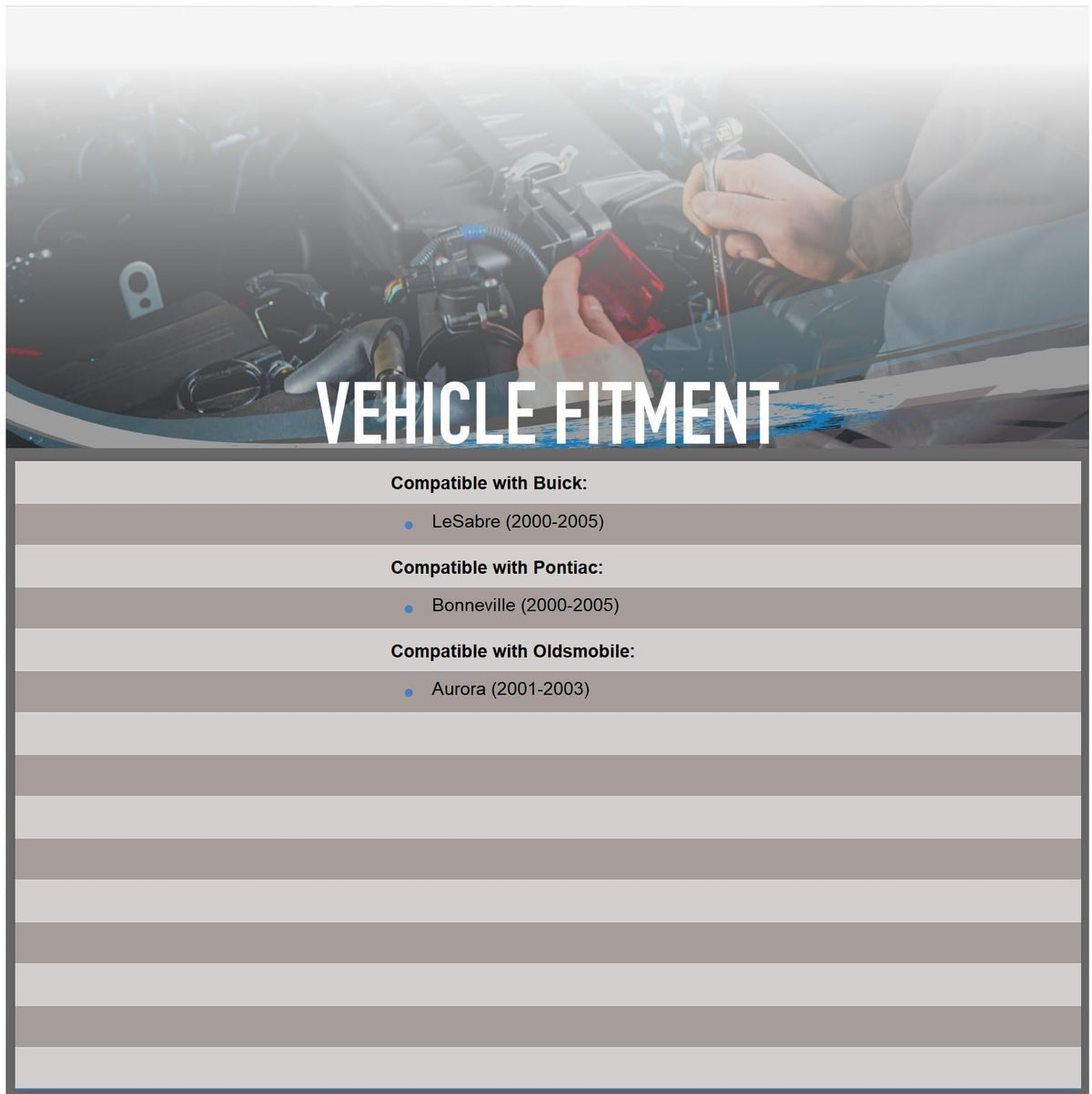 POSITION: Front Wiper Motor FEATURE 1: Includes Pulseboard This list is a sample of all the compatible cars for this part. Make sure this product fits your car by using the part finder above. REPLACEMENT FOR or COMPATIBLE WITH PONTIAC: Bonneville 00-05 REPLACEMENT FOR or COMPATIBLE WITH OLDSMOBILE: Aurora 01-03 REPLACEMENT FOR or COMPATIBLE WITH CADILLAC: DeVille 00-05 REPLACEMENT FOR or COMPATIBLE WITH BUICK: LeSabre 00-05