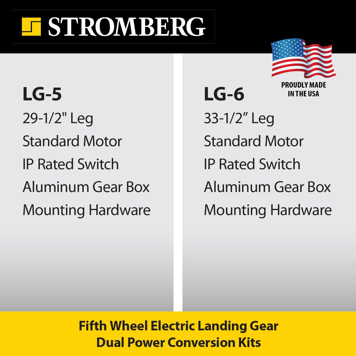 Q: What are the benefits of using the Stromberg Carlson LG-6 Dual Power Conversion Kit?A: The Stromberg Carlson LG-6 Dual Power Conversion Kit enhances your 5th wheel RV's landing gear system by providing powerful lifting capabilities with its 5000 lb motor, improving stability and leveling efficiency. Its robust 33.5" lead leg ensures durability, while the IP-rated switch allows for safe operation in wet conditions.