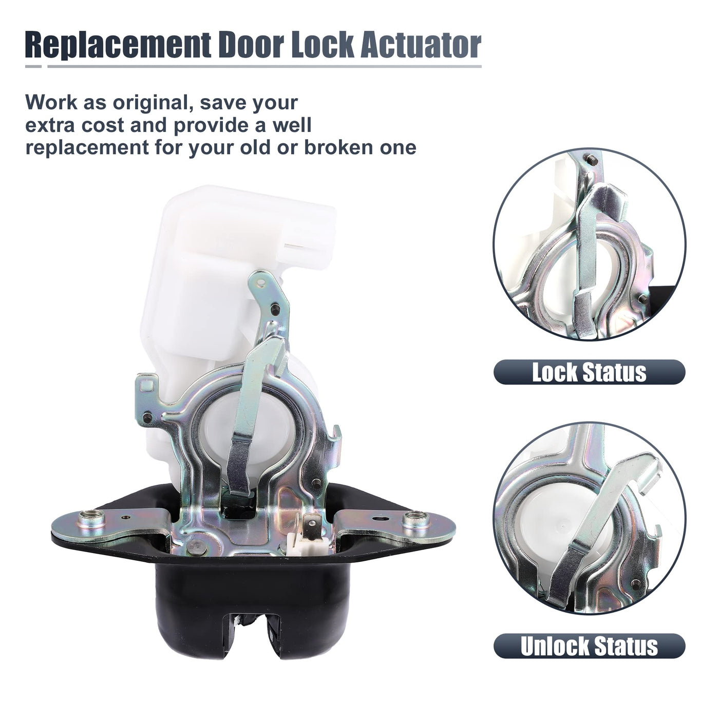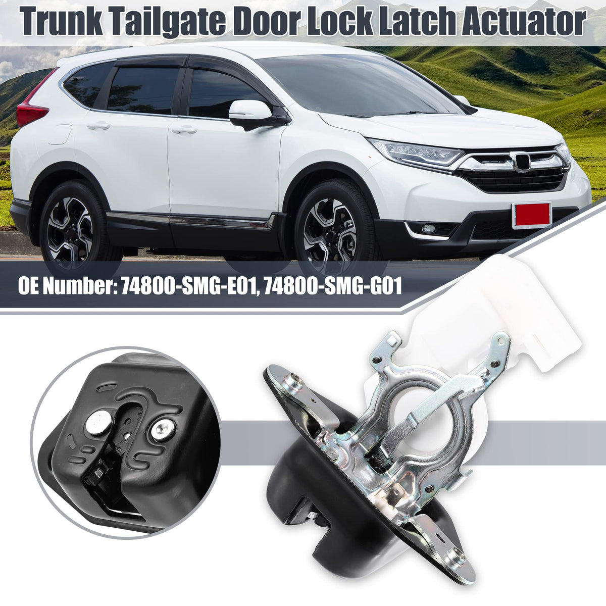 OE Number: 74800-SMG-G01, 74800-SMG-E01Fitment:For Honda CR-V EX, EX-L, LX 2.4L L4-Gas 2007 2008 2009 2010For Honda CR-V EX, EX-L, LX, SE 2.4L L4-Gas 2011For Honda Pilot EX, EX-L, LX 3.5L V6-Gas 2009 2010 2011Please confirm car make, model, year and OE number before purchaseSpecificationCondition: NewColor: Black, WhiteMaterial: Plastic, MetalNumber of Pin: 2 Size: 13.5x6.6x11.5cm / 5.31inx2.60inx4.53inHole Inner Diameter: 7mm / 0.28''Installation Position: TailgateFitment Type: Direct replacementInclude: 1 x tailgate lock actuator motorWhy need to replace trunk latch?Trunk lock wouldn't engage on the actual hook down the bottomRear Trunk latch can't closed, lock or unlock remotelyThe original latch actuator was broken/damgeHow to install rear trunk lid lock latch actuator?Remove the guard board.Take trunk release cable and side pin, loosen install bolts.Link the new latch and tight bolts, connect the cable and pin.Above is for reference, please search video ''For Honda CR-V/Pilot Trunk Latch replacement'' when replace it in doubt.NoticeThis is a non-OEM product, accessory only!