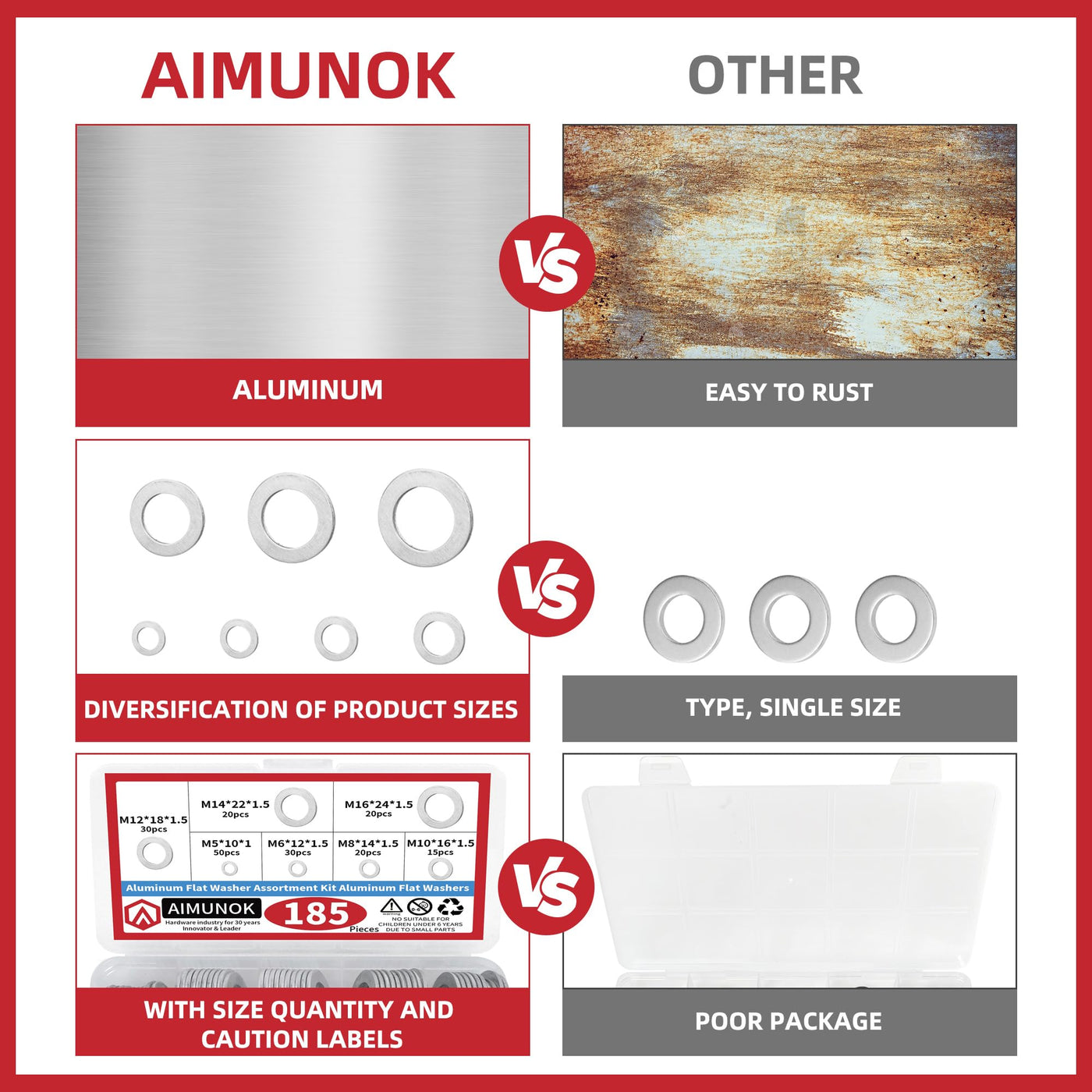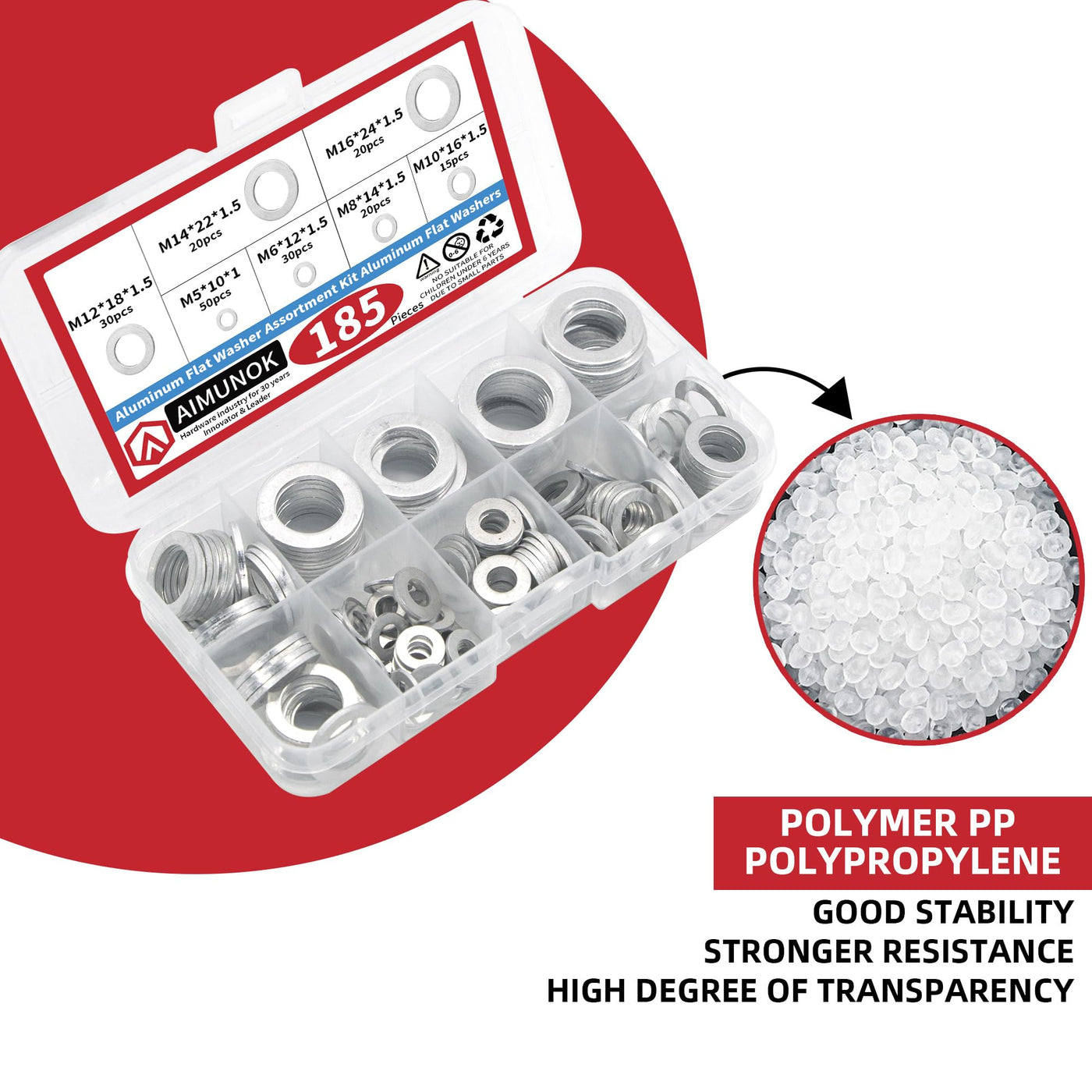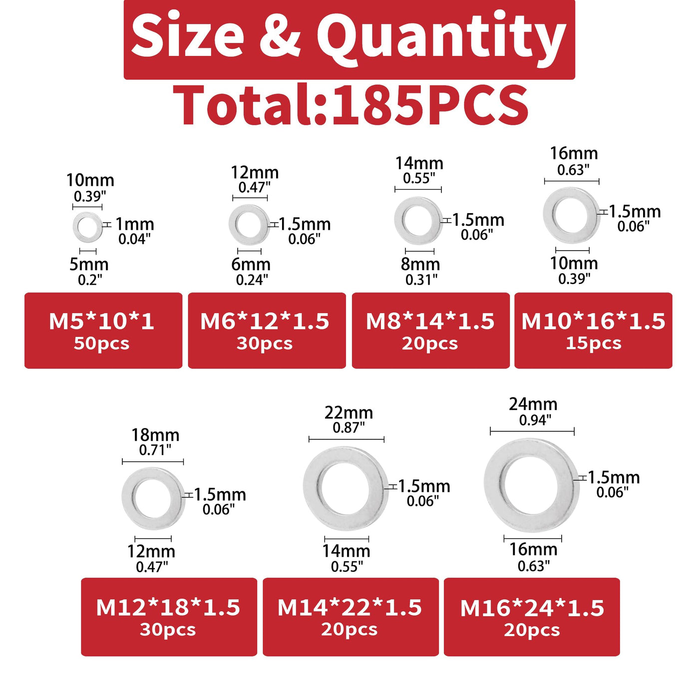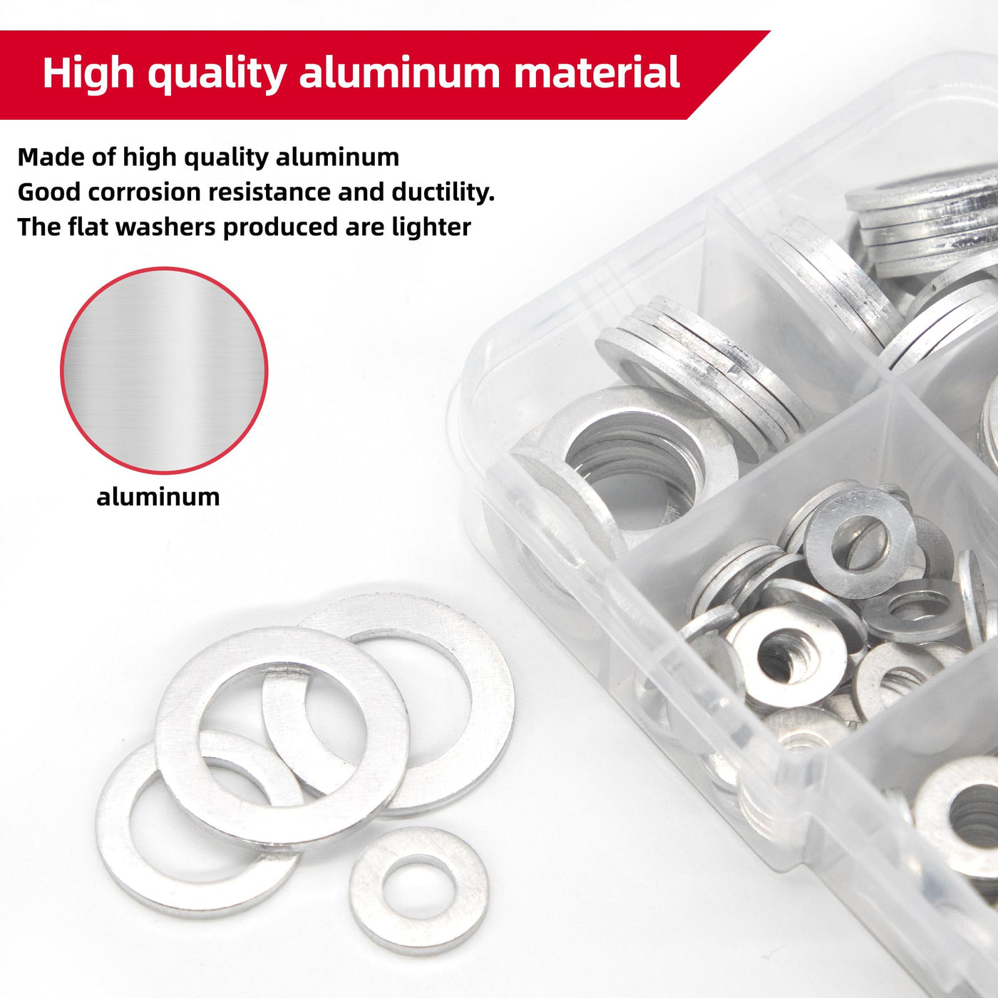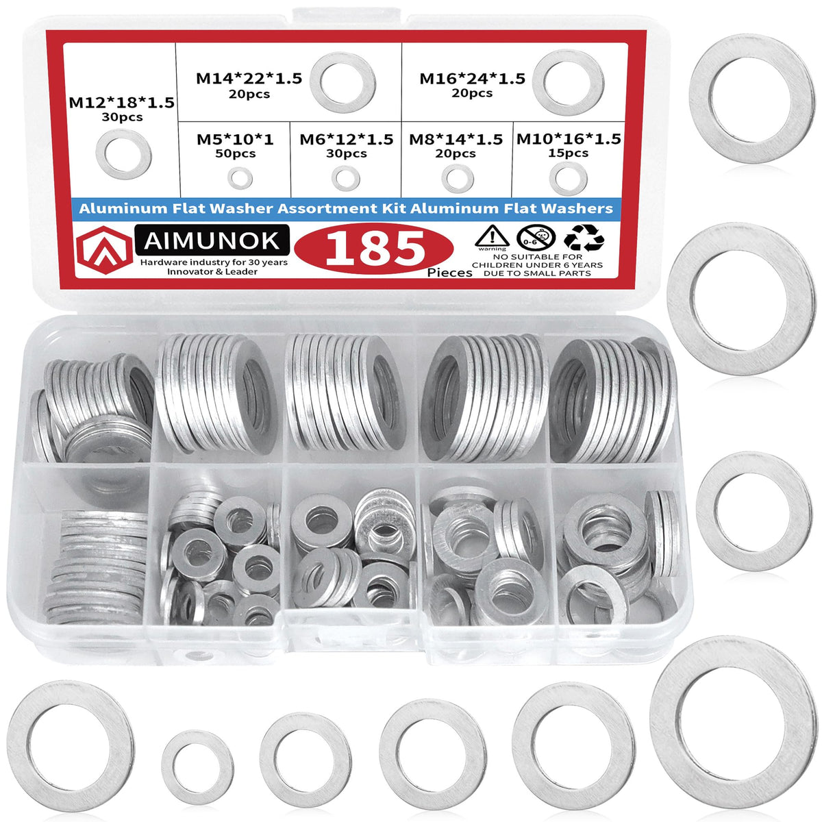 AIMUNOK 185 Pcs High Quality Automotive Aluminum Flat Washer Assortment Kit, Including 7 Different Sizes Made by high quality materials, it haave good corrosion resistance in hard environment:high temperature, cold weather, and high humidity environments. Widely used in automotive or electrical applications such as oil lines, hydraulic fittings, oil drain etc. Package included: M5 10 1 ----- 50Pcs M6 12 1.5 ----- 30Pcs M8 14 1.5 ----- 20Pcs M10 16 1.5 ----- 15Pcs M12 18 1.5 ---- 30Pcs M14 22 1.5 -----20Pcs M16 24 1.5 -----20Pcs Total Quantity: 185Pcs Have a handy stroage box easy to pick and use. If you have any questions please tell us.
