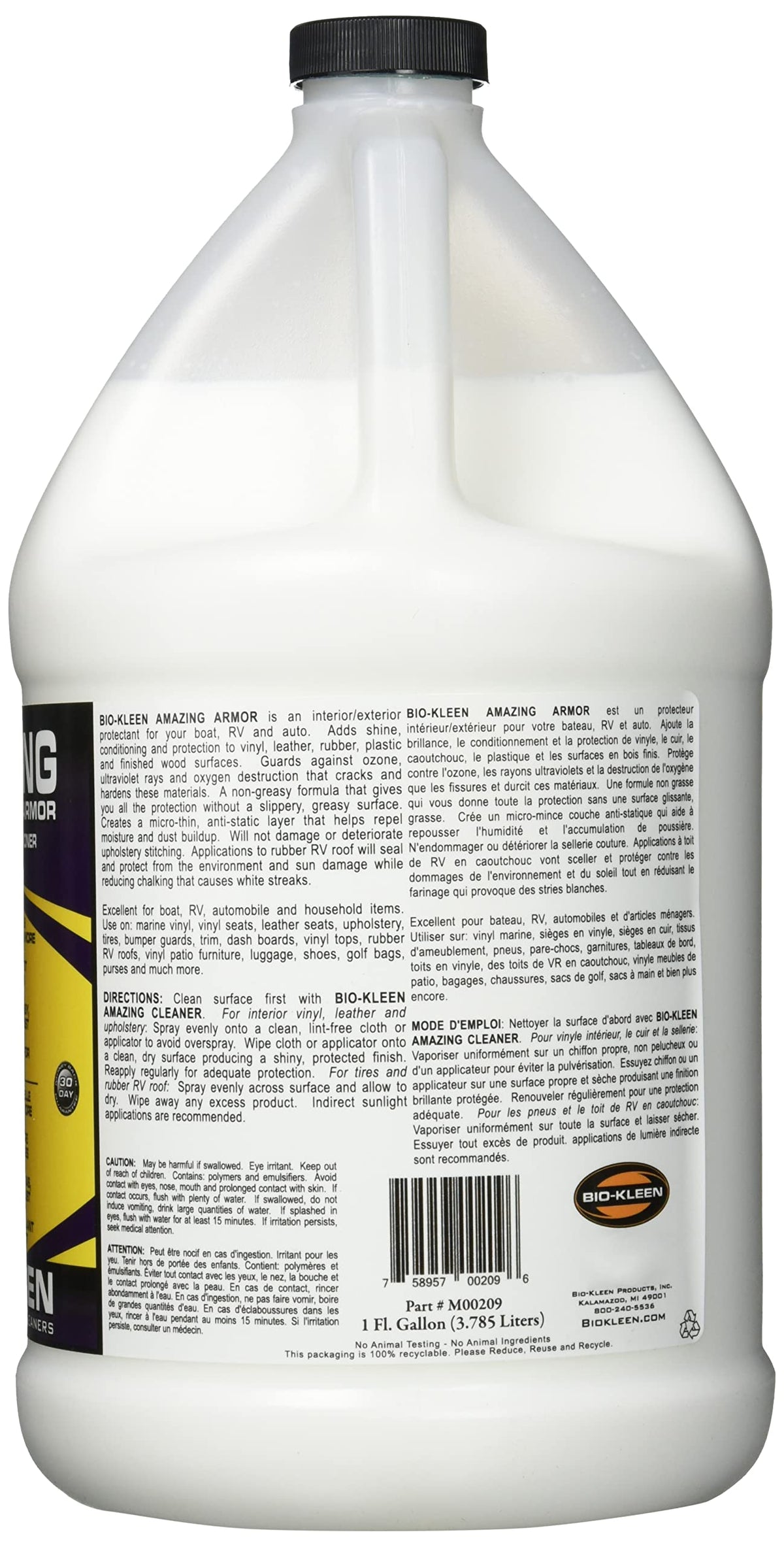 Bio-Kleen Amazon Armor Is An Interior/Exterior Protectant For Your Boat, Rv And Auto. Adds Shine, Conditioning And Protection To Vinyl, Leather, Rubber, Plastic And Finished Wood Surfaces. Guards Against Ozone, Ultraviolet Rays And Oxygen Destruction That Cracks And Hardens These Materials. A Non-Greasy Formula That Gives You All The Protection Without A Slippery, Greasy Surface. Creates A Micro-Thin, Anti-Static Layer That Helps Repel Moisture And Dust Buildup. Will Not Damage Or Deteriorate Upholstery Stitching. Applications To Rubber Rv Roof Will Seal And Protect From The Environment And Sun Damage While Reducing Chalking That Causes White Streaks.