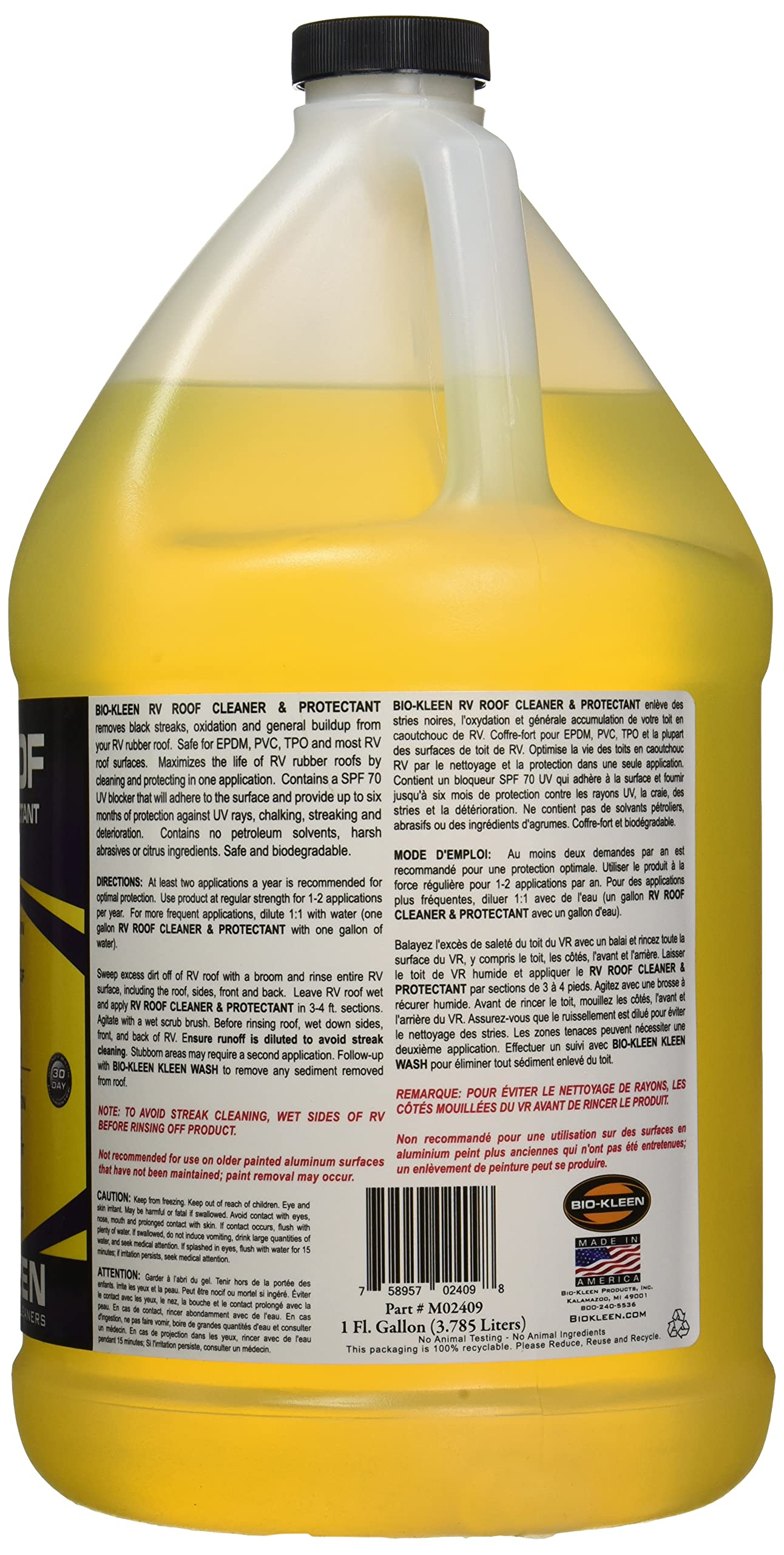 Bio-Kleen Rv Roof Cleaner And Protectant Removes Black Streaks, Oxidation And General Buildup From Your Rv Rubber Roof. Safe For Epdm, Pvc, Tpo And Most Rv Roof Surfaces. Maximizes The Life Of Rv Rubber Roofs By Cleaning And Protecting In One Application. Contains A Spf 70 Uv Blocker That Will Adhere To The Surface And Provide Up To Six Months Of Protection Against Uv Rays, Chalking, Streaking And Deterioration. Contains No Petroleum Solvents, Harsh Abrasives Or Citrus Ingredients. Safe And Biodegradable.