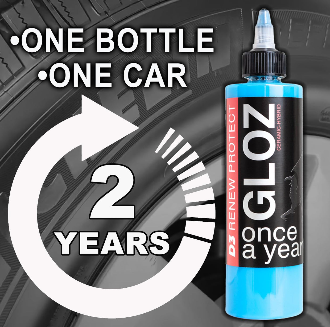Q: How often should I apply the Renew Protect GLOZ for optimal results?A: For best results, apply GLOZ every 3 to 12 months on tires, every 1 to 2 years on car trim, and every 4 to 5 years on golf carts and motorcycles. This schedule ensures maximum UV protection and longevity.