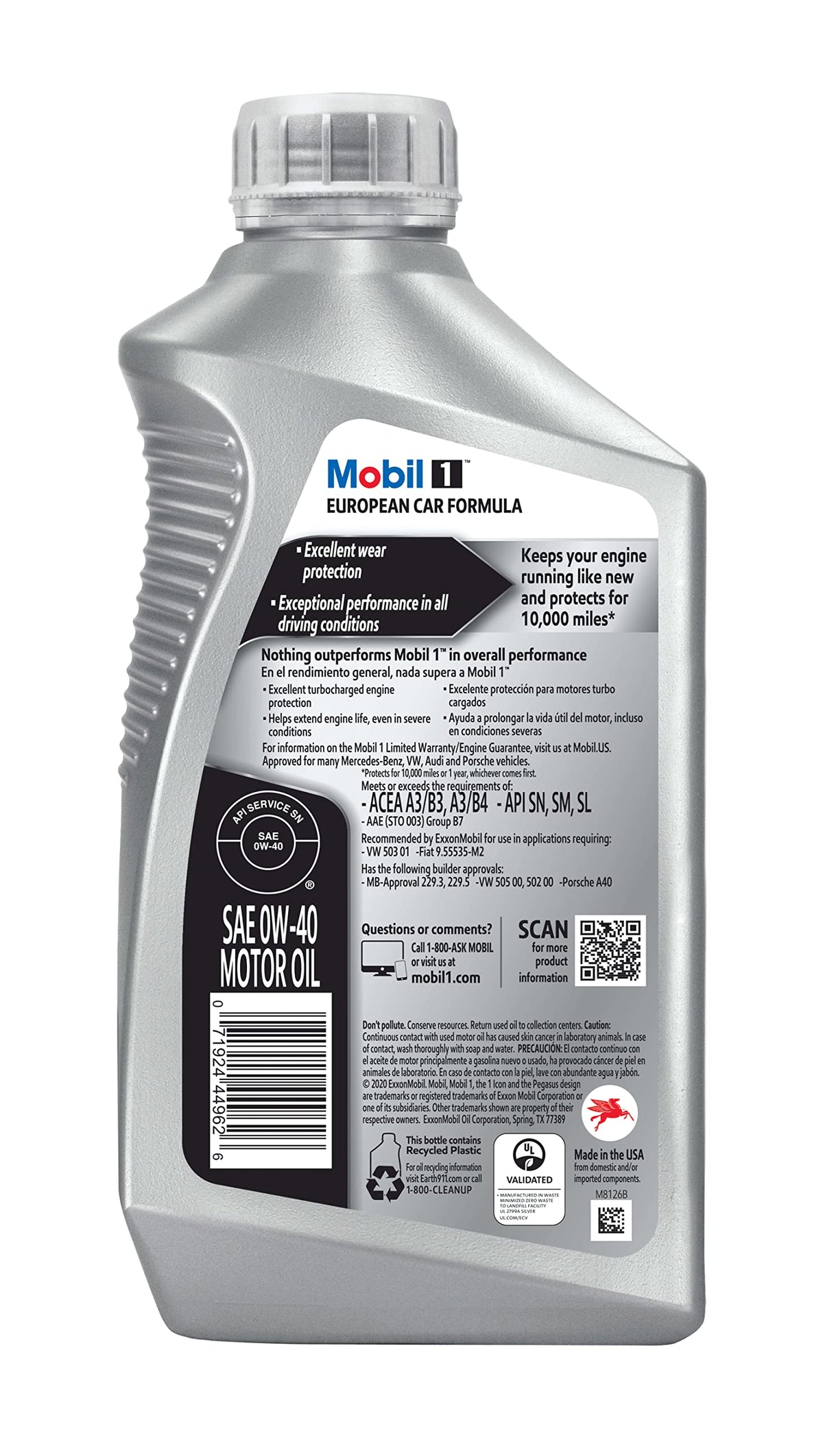 Product Descriptionmobil 1 Fs European Car Formula 0W-40 Helps To Extend Engine Life, Even In Severe Conditions, And Protects Critical Engine Parts For Up To 10,000 Miles Between Oil Changes*. Its Uniform Synthetic Oil Molecules Reduce Friction, Helping To Prevent Deposits And Sludge Buildup. This Technologically Advanced Formulation Provides Excellent Internal Engine Heat Protection (Up To 500 Degrees Fahrenheit), And Low-Temperature Protection (To -40 Degrees Fahrenheit), Supporting Quick Cold-Weather Starting And Ultra-Fast Protection. Mobil 1 Fs European Car Formula 0W-40 Also Helps Control Oxidation To Prevent Oil Breakdown. Approved For Many Mercedes-Benz, Vw, Audi And Porsche Vehicles, This Formula Provides Excellent Turbocharged Engine Protection. Mobil 1 Is Americas Leading Synthetic Motor Oil Brand At Retail**, Recommended By Car Builders And Experienced Mechanics, And Is The Official Motor Oil Of Nascar. (*Protects For 10,000 Miles Or 1 Year, Whichever Comes First. To Learn More About The Mobil 1 Limited Warranty, Visit Mobil.Us. **Source: The Npd Group/ Retail Tracking Service/ Dollar Sales/ Pcmo Full Synthetic/ 52 Weeks Ending September 30, 2023)Amazon.Commotor Oil Is Made From Crude Oil And Is Used To Lubricate, Clean, And Cool Engines. Types Of Motor Oil Include Conventional, Synthetic, Diesel, Bio-Based, Hybrid (Blends Of Conventional And Synthetic), And Recycled Oils. Motor Oil Varies In Weight And Viscosity, As Well As Additives That Some Manufacturers Add To The Oil During The Refining Process. A Numerical Code System Created By The Society Of Automotive Engineers (Sae) Grades Motor Oils According To Viscosity--The Higher The Number Between 0 And 60, The More Viscous (Thicker) The Oil Is. Most Consumer Motor Oils Are Graded By Two Numbers, With The First Number Indicating Cold Weather (Winter Or ''W'') Performance. Sae 0W-40This Oil Has A Weight Of Sae 0W-40, Meaning It Has An Sae Viscosity Rating Of 0 In Cold Temperatures And A Rating Of 40 At Normal Operating Temperature. Always Check Your Vehicle'S Owner'S Manual To Verify That This Is The Correct Weight Of Motor Oil For Your Vehicle. Full Synthetic Oilthis Oil Is A Full Synthetic Oil, Meaning Crude Oil Is Not Used In Making It. Synthetic Oil Can Be Used In Vehicle Engines Instead Of Motor Oils Refined From Crude Oil, And Often Provides Superior Mechanical Performance Over Traditional Motor Oil, Including Increased Gas Mileage And Reduced Engine Wear At Extreme Temperatures. Its Complex Method Of Production Means It Can Often Cost More Than Conventional Motor Oil.