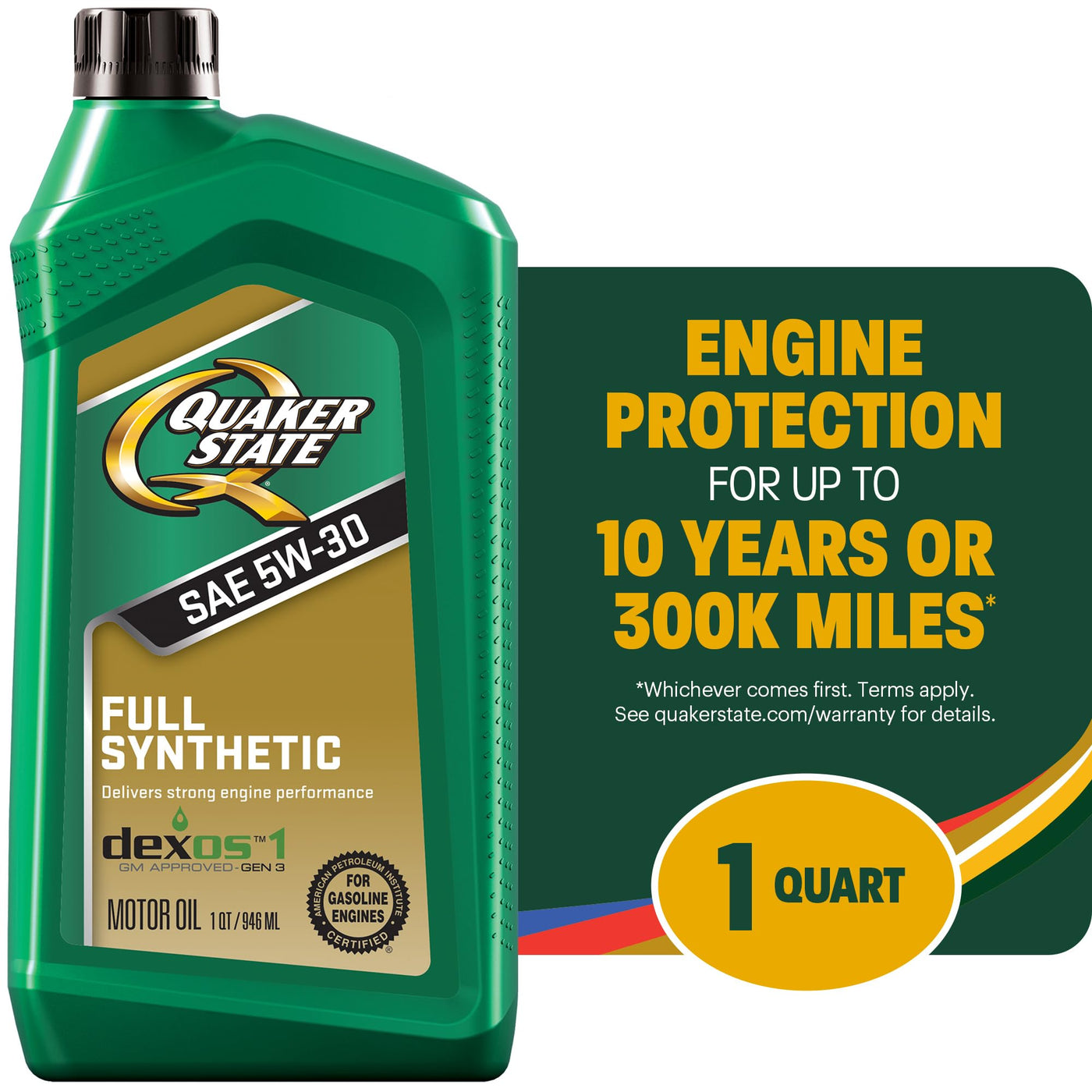 Q: What is the warranty for Quaker State Full Synthetic Motor Oil?A: Quaker State offers a warranty of up to 10 years or 300,000 miles, whichever comes first, provided you exclusively use Quaker State Full Synthetic, Synthetic, High Mileage, or conventional motor oils. Enrollment and receipt retention are required, and terms apply.