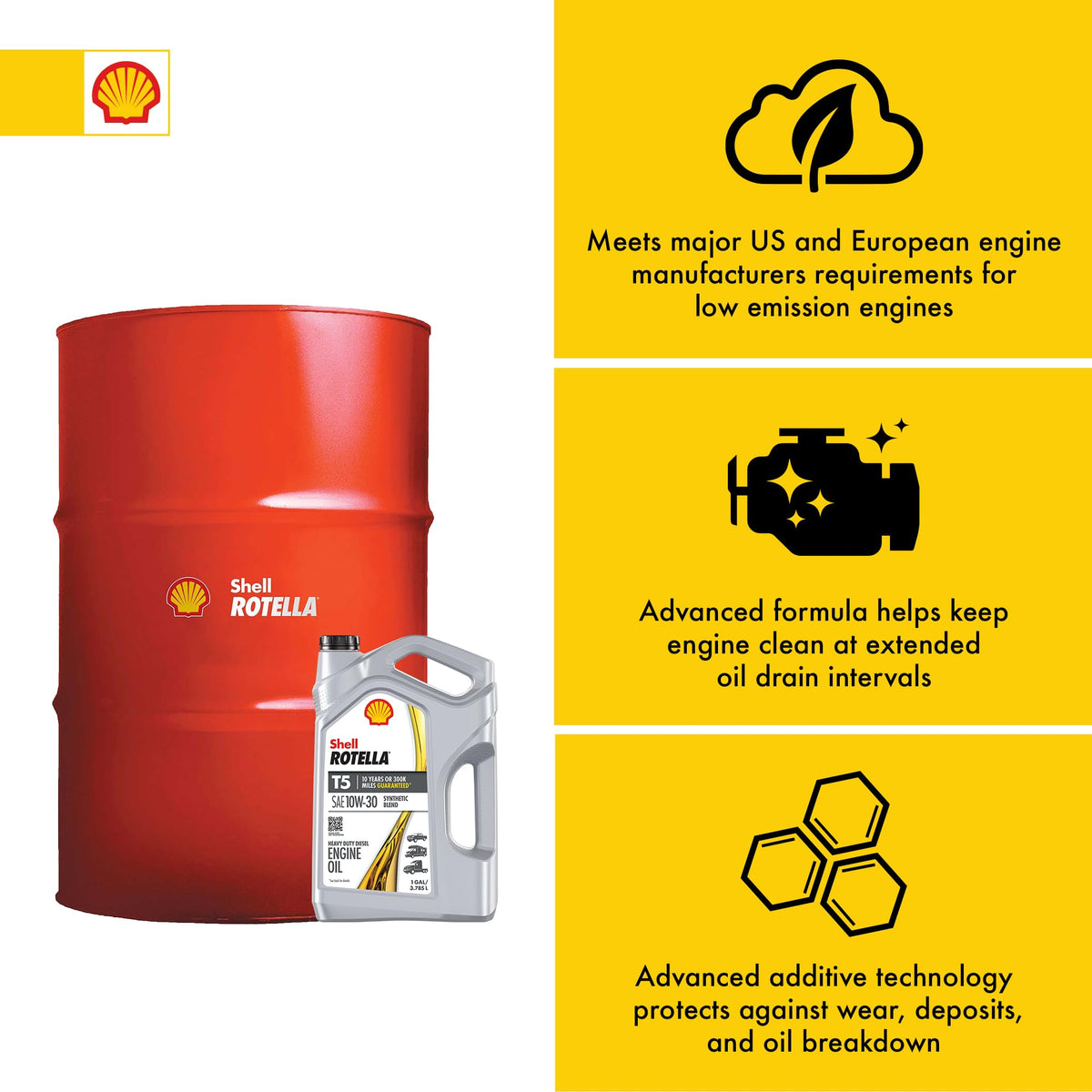 Shell Rotella T5 10W-30 Synthetic Blend Diesel Engine Oil With Triple Protection Plus Technology Combines Synthetic Base Oils And Advanced Additive Technology To Provide Protection Against Wear, Deposits, And Oil Breakdown. Triple Protection Plus Technology Also Provides Better Low Temperature Flow, And Shell Rotella T5 10W-30 Delivers Better Cold Cranking Properties Than Conventional 15W-40 Oils, Reaching Critical Engine Parts Faster In Colder Temperatures To Minimize Wear In Harsh Climates. It Also Provides Fuel Economy Savings Up To 2%, Compared To A Conventional 15W-40, Helping You Stretch Your Budget And Improve Your Bottom Line. Shell Rotella T5 10W-30 Synthetic Blend Is Suitable For A Wide Range Of Heavy Duty Engine Applications. It Is An Excellent Choice For On-Highway Fleets, Construction, Agriculture, And Diesel Pick-Up Trucks, Including High-Power Vehicles Where Resistance To Increased Heat And Stress Is Required. Providing Excellent Wear Protection Beyond The Recommended Oil Drain Interval Of 50,000 Miles Common For Many Engine Manufacturers, Shell Rotella T5 10W-30 Synthetic Blend Protects Your Engine Like A Heavier Viscosity Engine Oil. Meets Or Exceeds The Following Industry Requirements: Api Ck-4, Cj-4, Ci-4 Plus, Ci-4, Ch-4; Acea E9. Exceeds The Requirements Of The Following Oem Specifications: Caterpillar Ecf-3, Ecf-2; Cummins Ces 20086, 20081; Detroit Fluid Specification 93K222, 93K218; Deutz Dqc Iii-10 La; Ford Wss-M2C171-F1; Jaso Dh-2; Mack Eo-S 4.5, Eo-O Premium Plus; Man M 3575; Mb-Approval 228.31; Mtu Category 2.1; Volvo Vds-4.5, Vds-4. For Technical Questions, Contact The Shell Technical Help Desk.