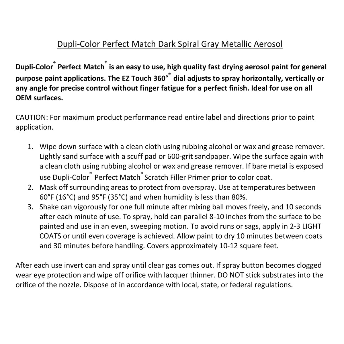 Q: How do I apply Dupli-Color Perfect Match paint?A: For the best results, shake the can well before use, hold it 8-12 inches away from the surface, and apply in even, sweeping motions. Allow adequate drying time between coats for optimal coverage.