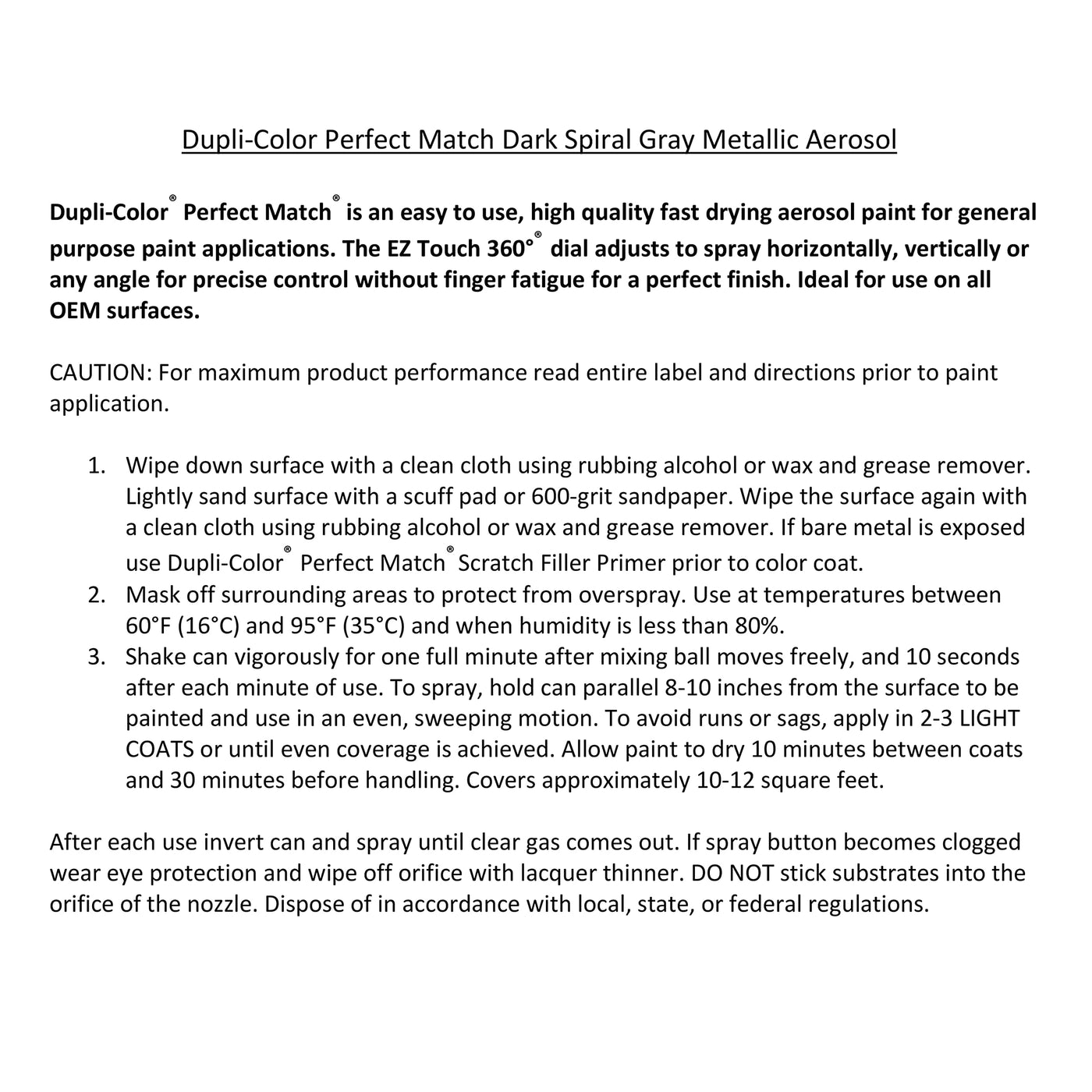 Dupli-Color Perfect Match Premium Automotive Paint is an easy-to-use, high-quality, fast-drying, acrylic lacquer aerosol paint specially formulated to exactly match the color of the original factory applied coating. Ideal for use on all OEM paint surfaces, Perfect Match is available in a complete line of exact-match colors for current and late model import and domestic vehicles, making this product ideal for both small scale vehicle touch-up and for painting vehicle accessories. For the final step in the exact color match process and to provide additional gloss and protection, finish with Duple-Color Perfect Match Clear Coat.
