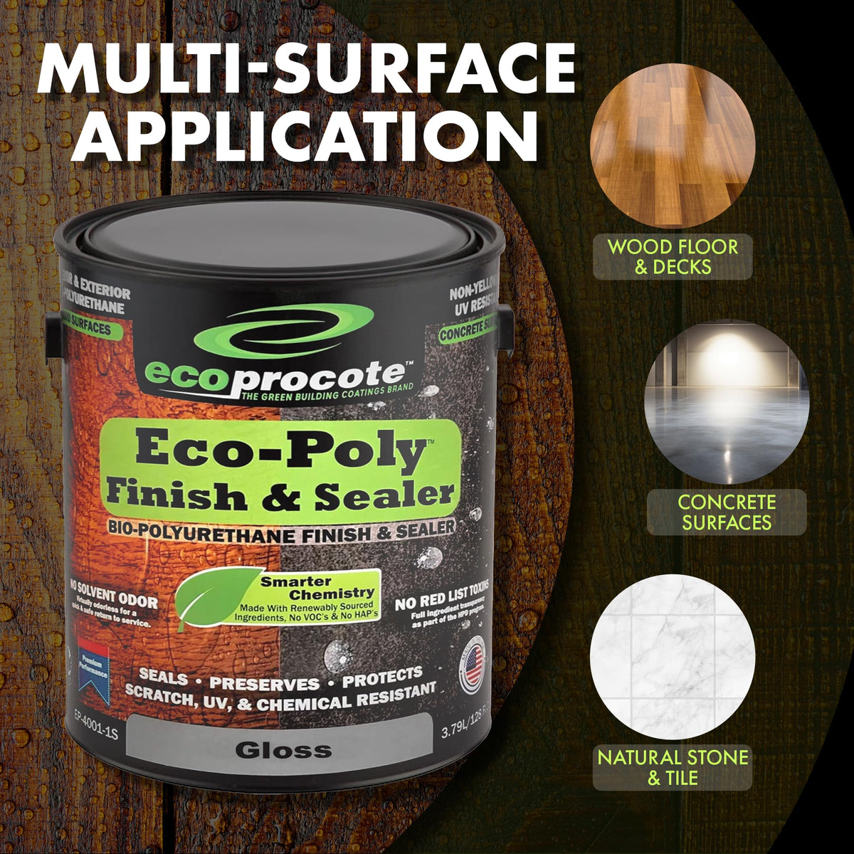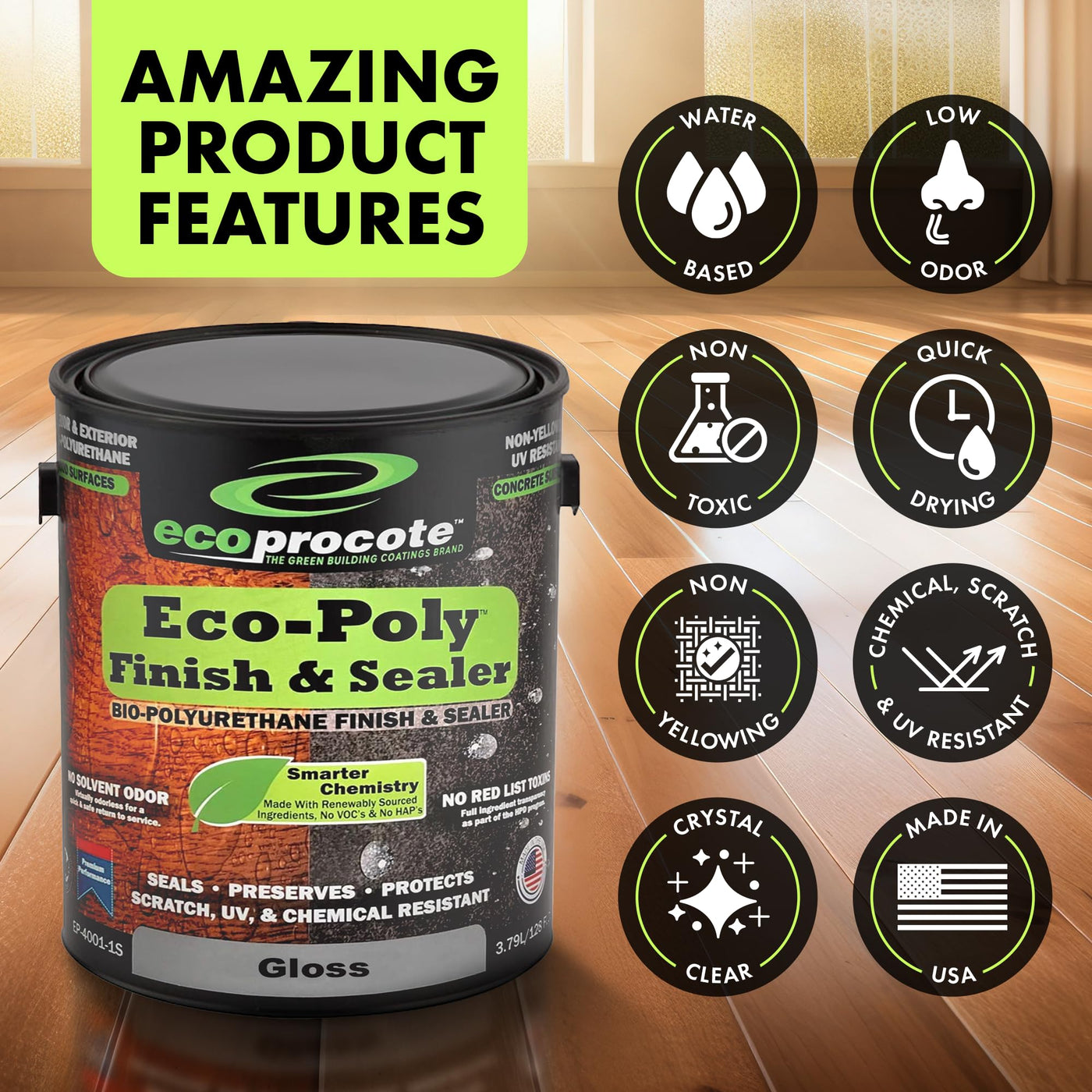 HIGH QUALITY SURFACE FINISH: Our polyurethane sealer for wood, floor, and concrete surfaces provides scratch, crack, moisture, UV and chemical resistance, ensuring a long-lasting sheen for your indoor and outdoor projects. WATER-BASED, LOW ODOR: Made with water-based polyurethane, this gloss finish sealer is virtually odorless and dries faster than oil-based counterparts. MULTI-LAYER PROTECTION: The Eco-Poly sealer is formulated to be highly durable. For best results and optimum sealing, apply a minimum of two coats on the surface for an elegant gloss finish. VERSATILE USES: Excellent for applying a protective wood finish to your furniture, cabinets, decks, and wood floors. It can also be used as a masonry, concrete driveway sealer, and concrete floor sealer. NON-TOXIC, SUSTAINABLE: The Eco-Poly wood and concrete polyurethane sealer is made with advanced plant-based urethane technology and bio-emulsion resins. It is free of toxic off gassing, VOCs and Red List Chemicals. polyurethane wood finish wood sealer wood finish wood floor sealer clear wood sealer wood clear coat home improvement polyurethane clear gloss clear coat concrete clear gloss home improvement paint supplies matte varnish clear polyurethane polyurethane varnish matte polyurethane water based varnish polyurethane satin polyurethane water based water based varnish polyurethane coating floor polyurethane polyurethane matte finish water based clear coat water based polyurethane